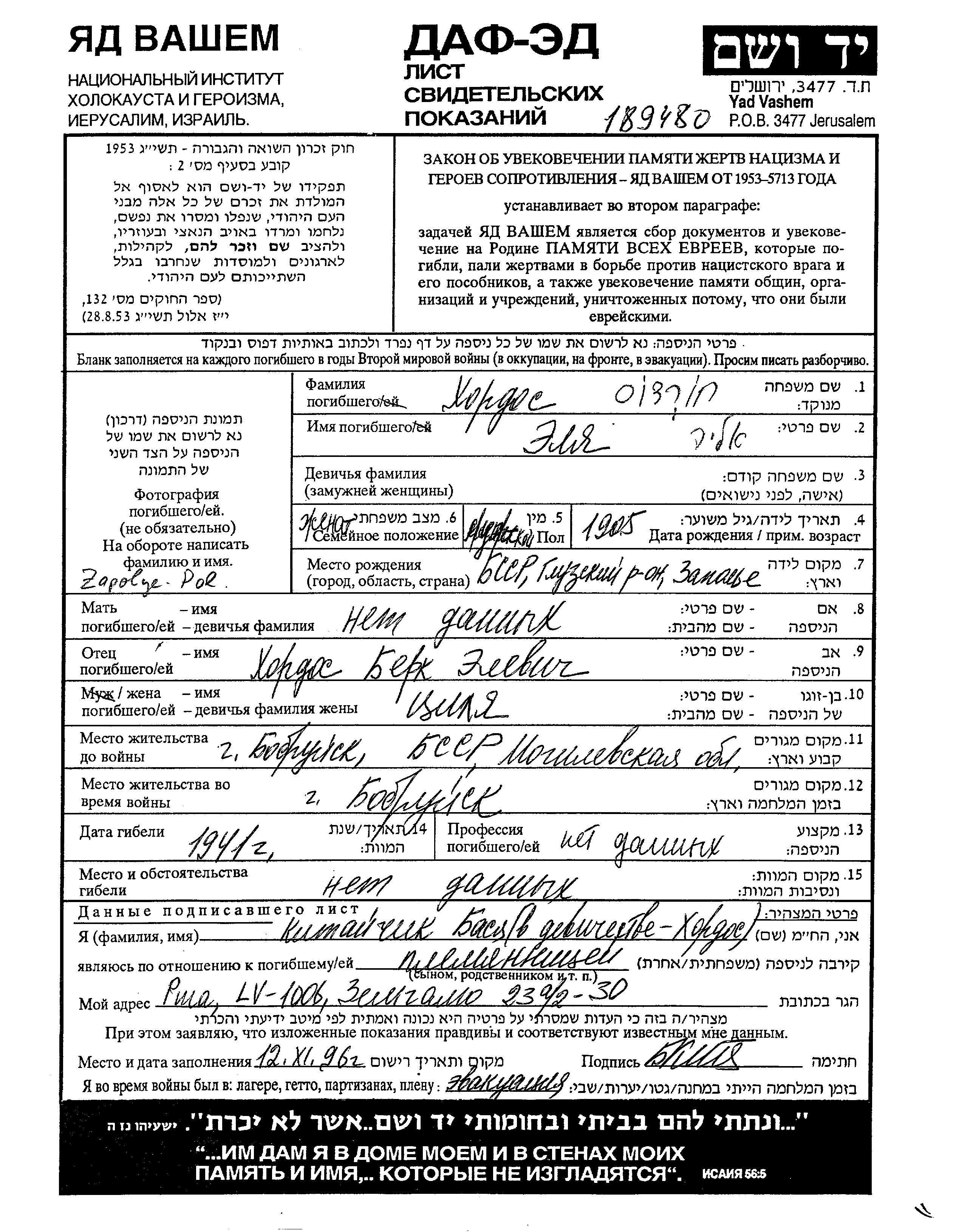 Elya Alia Khordos wurde im Jahr 1905 in Zapolye, Weißrussland (UdSSR) geboren. Er war der Sohn von Berk. Er war mit Tzilya Verheiratet. Vor dem Zweiten Weltkrieg lebte er in Bobruysk, Weißrussland (UdSSR). Während des Krieges war er in Bobruysk, Weißrussland (UdSSR).