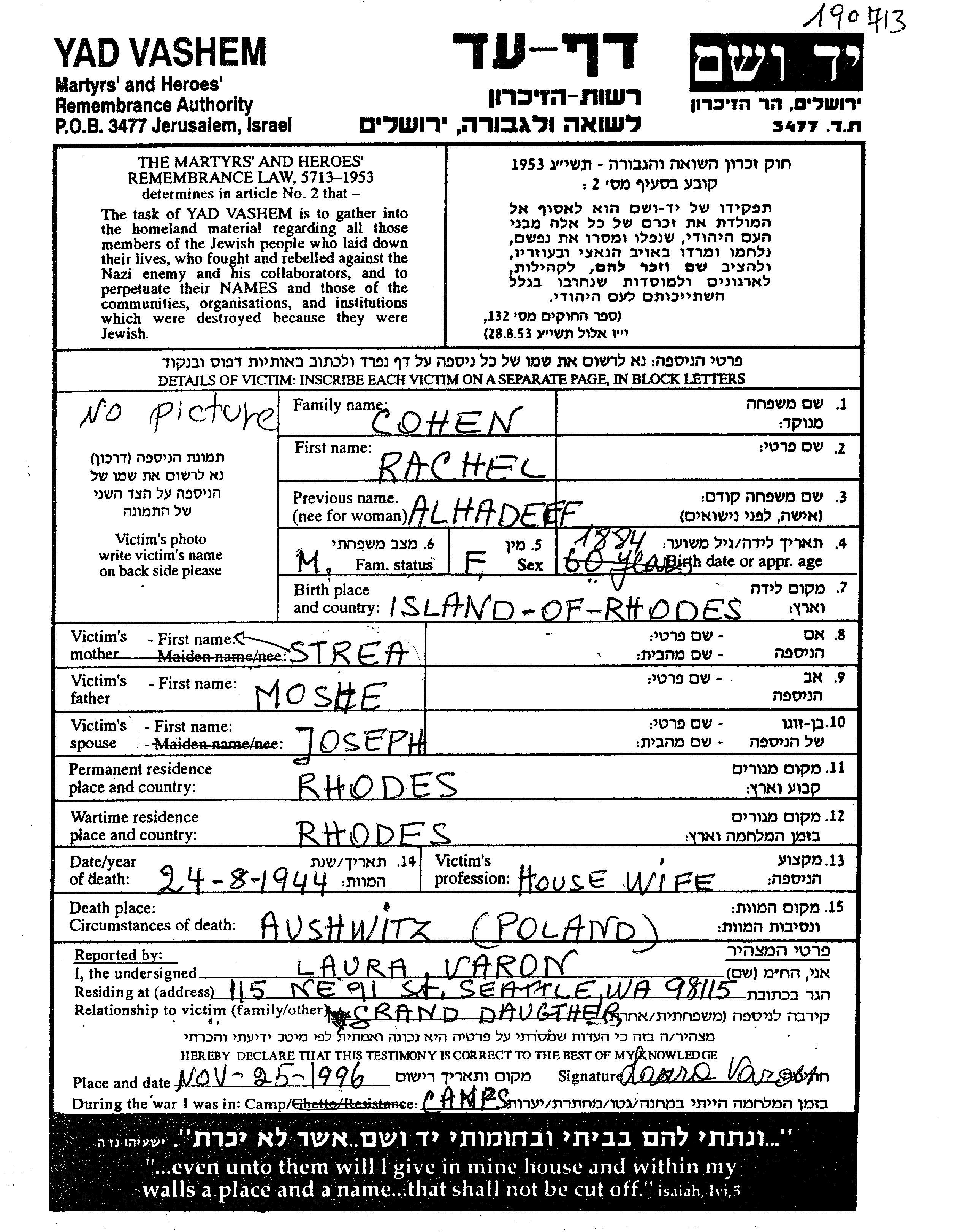 Rachel Cohen, geb. Alhadeff wurde im Jahr 1884 in Rhodes, Italien geboren. Sie war die Tochter von Moshe und Strea. Sie war Hausfrau und mit Joseph Verheiratet. Vor dem Zweiten Weltkrieg lebte sie in Rhodes, Italien. Während des Krieges war sie in Rhodes, Italien.