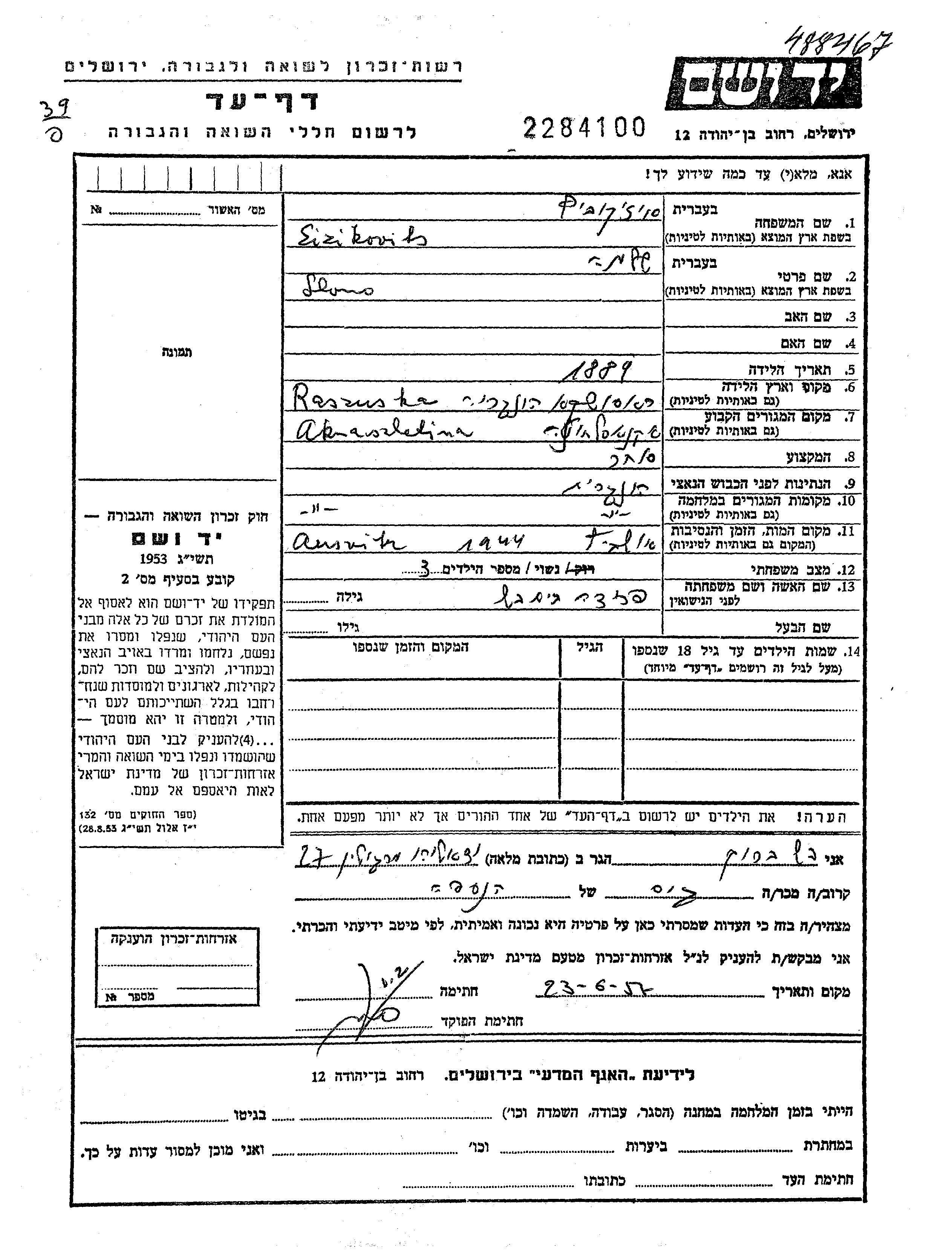 Slomo Eizikovits wurde im Jahr 1889 in Ruszinszko geboren. Er war Kaufmann/-frau und mit Frida Verheiratet. Vor dem Zweiten Weltkrieg lebte er in Aknaszlatina, Tschechoslowakei. Während des Krieges war er in Aknaszlatina, Tschechoslowakei.