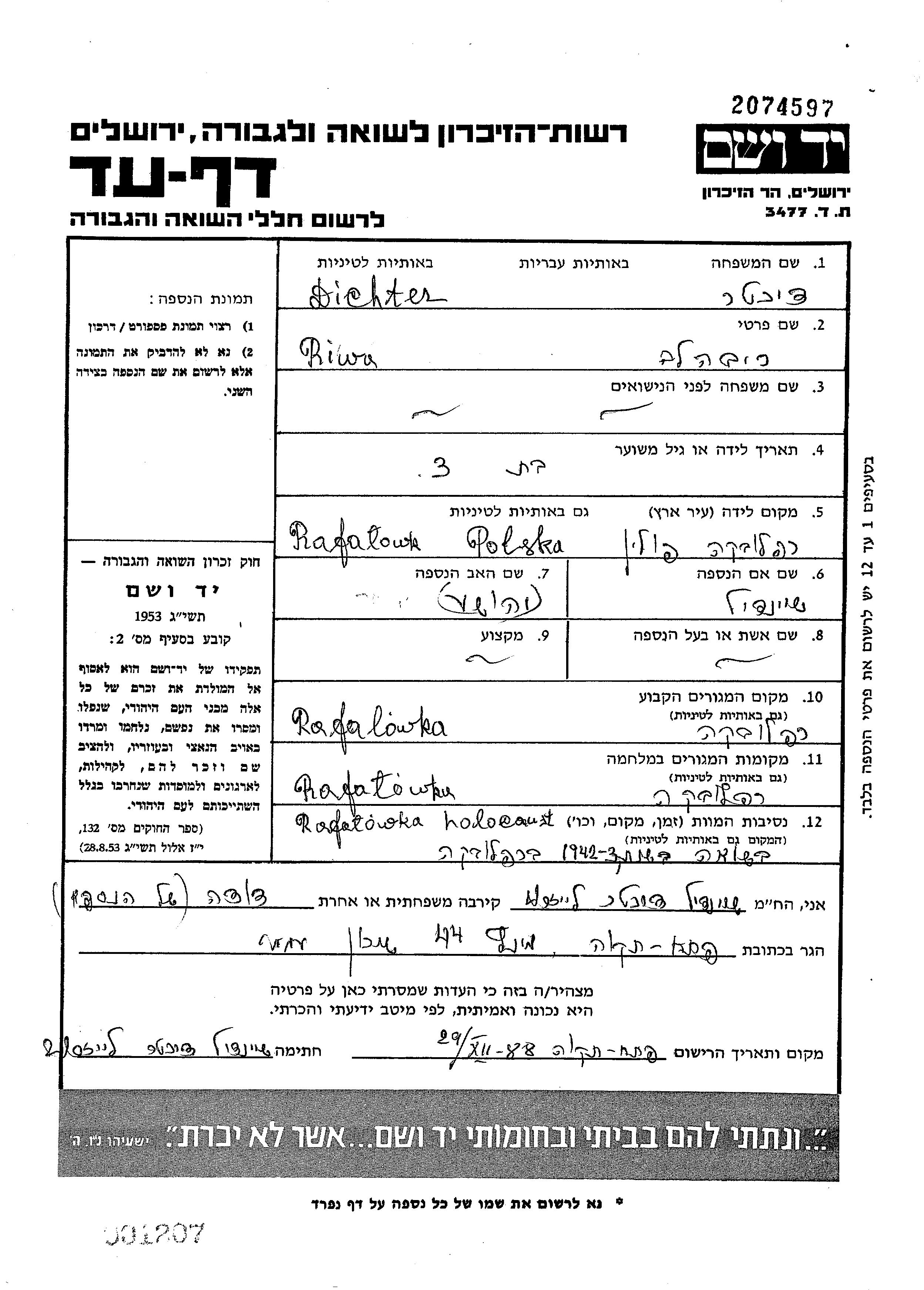 Riwa Dichter wurde im Jahr 1939 in Rafałówka, Polen geboren. Sie war die Tochter von Mojshe und Shejndla, geb. Wajngarten. Sie war Kind. Vor dem Zweiten Weltkrieg lebte sie in Rafałówka, Polen. Während des Krieges war sie in Rafałówka, Polen.