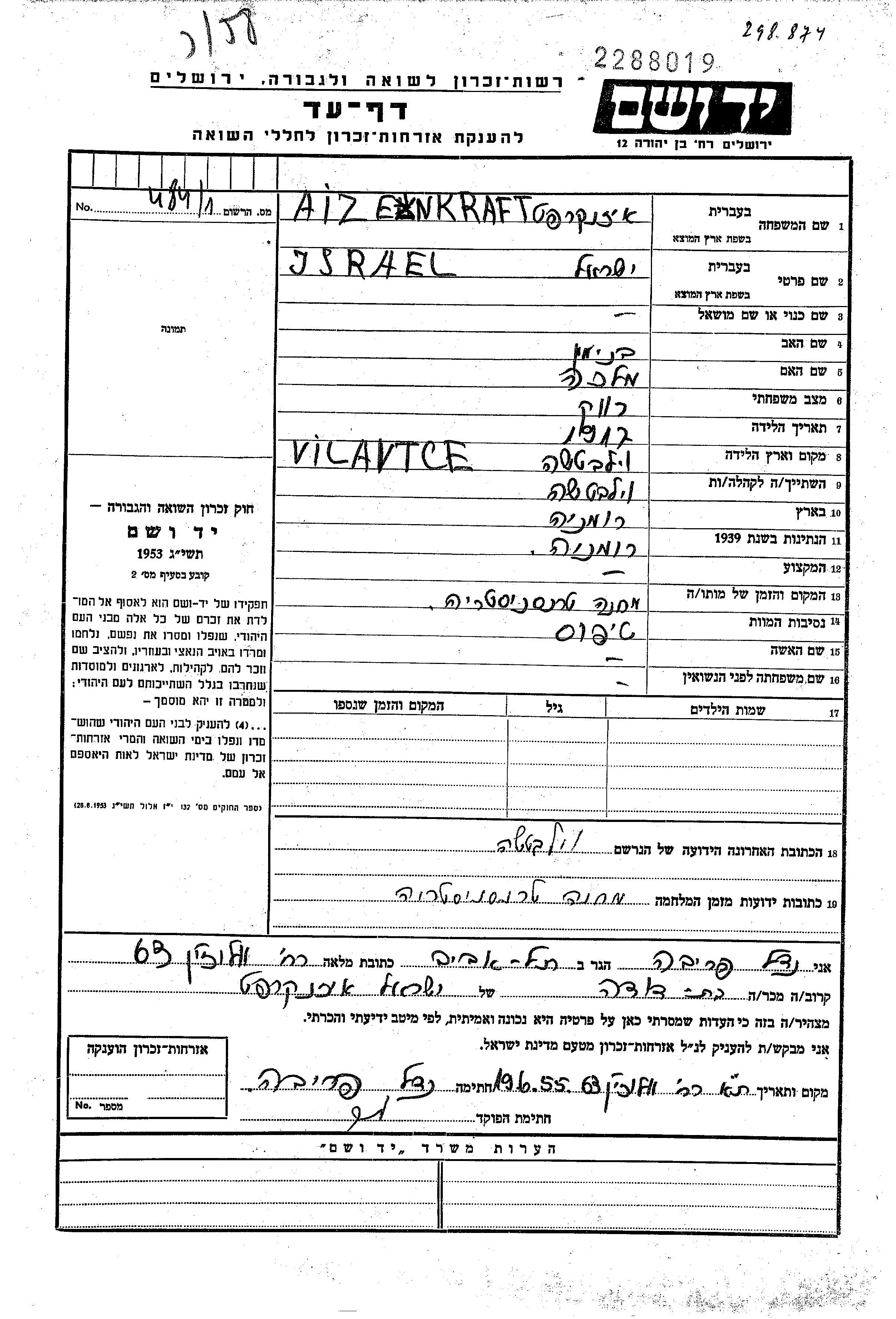 Israel Aizenkraft wurde im Jahr 1917 in Vilaucea, Rumänien geboren. Er war der Sohn von Biniamin und Malcka, geb. Dermer. Er war Ledig. Vor dem Zweiten Weltkrieg lebte er in Vilaucea, Rumänien. Während des Krieges war er in Transnistria, Ukraine (UdSSR).