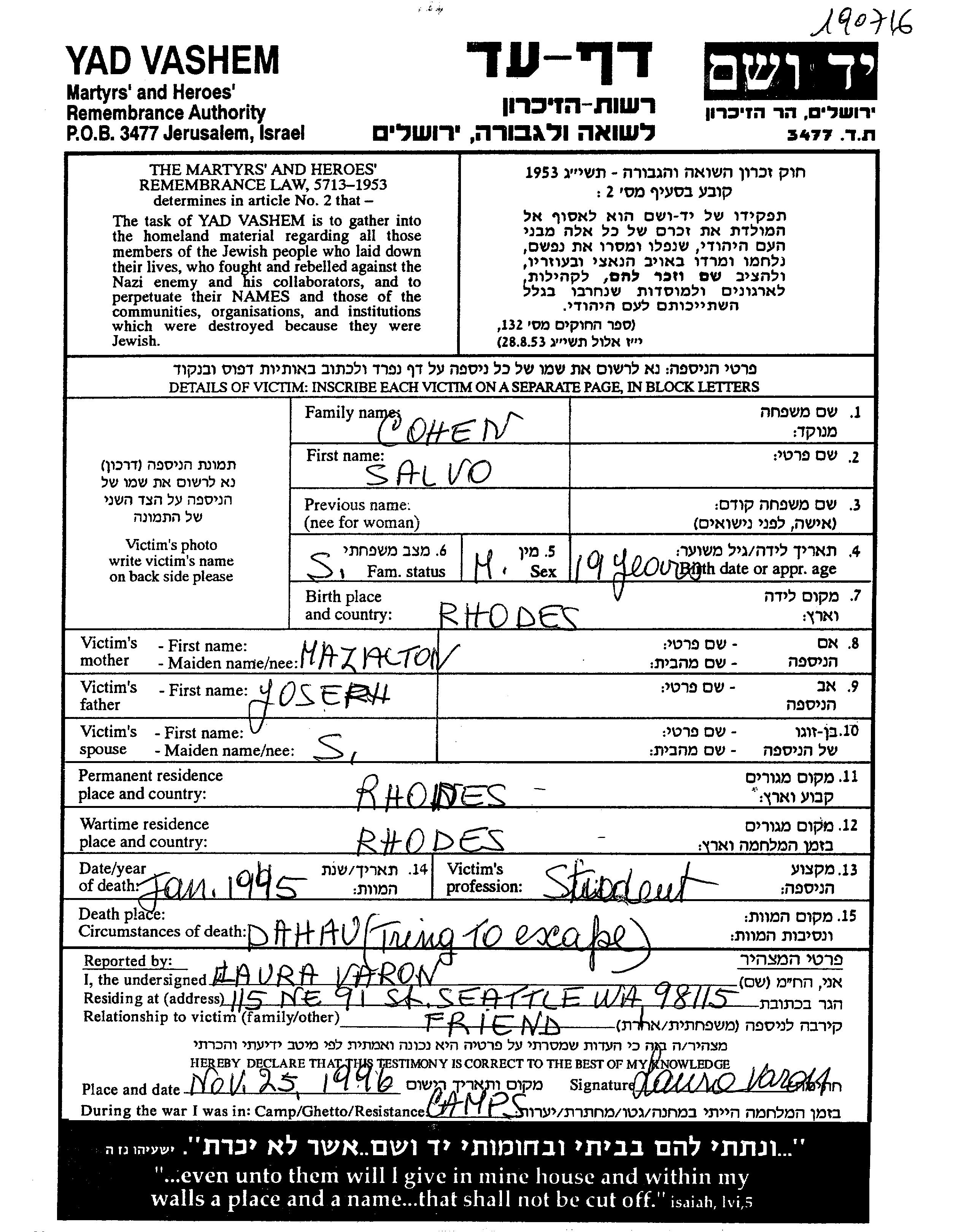 Salvo Cohen wurde in Rhodes, Italien geboren. Er war der Sohn von Yakov und Mazaltov, geb. Alhadeff. Er war Student und Ledig. Vor dem Zweiten Weltkrieg lebte er in Rhodes, Italien. Während des Krieges war er in Rhodes, Italien.