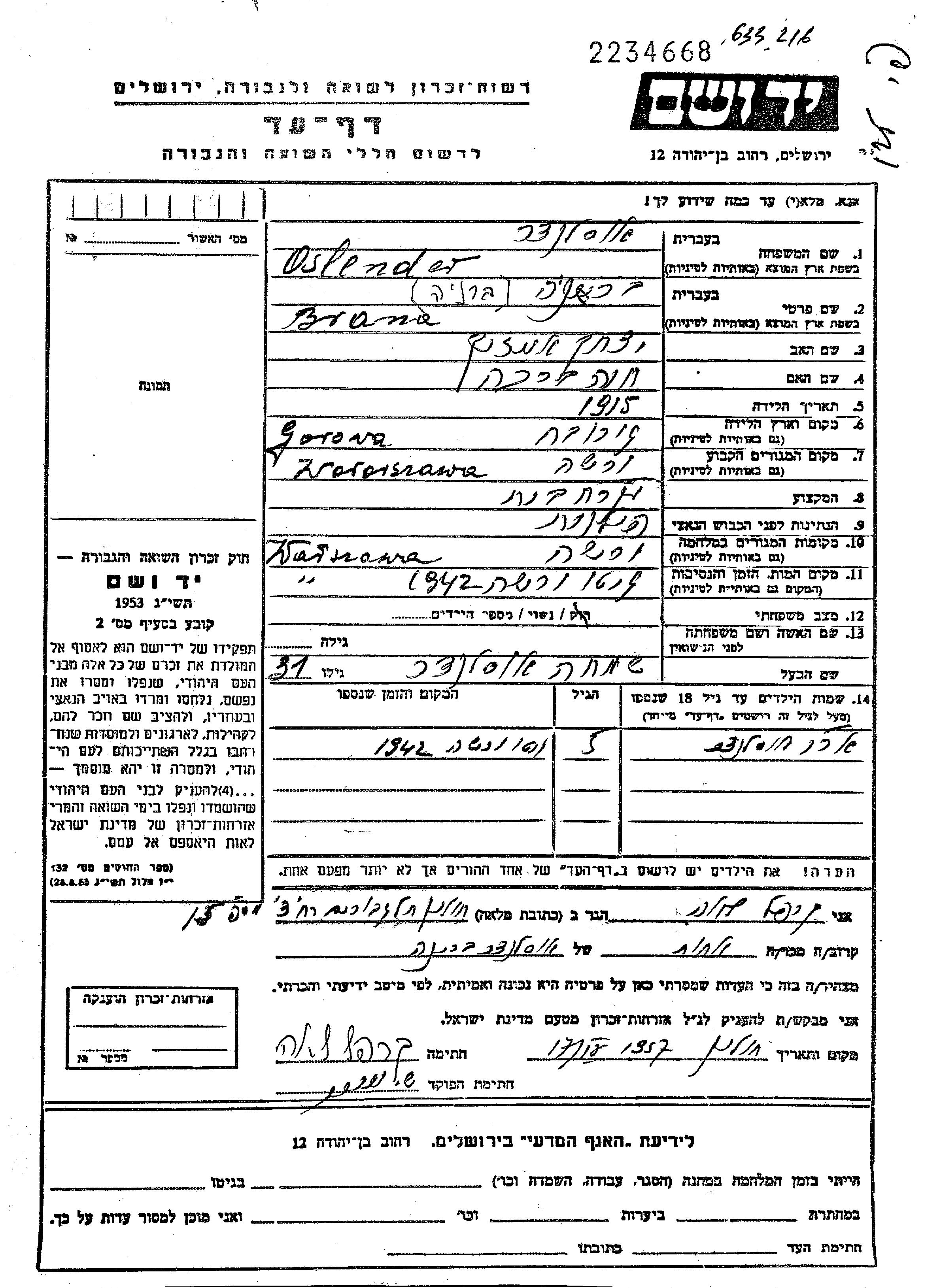 Brana Oslender wurde im Jahr 1915 in Gorowo, Polen geboren. Sie war die Tochter von Ytzkhak und Khava Brakha. Sie war Hausfrau und mit Simkha Verheiratet. Vor dem Zweiten Weltkrieg lebte sie in Warszawa, Polen. Während des Krieges war sie in Warszawa, Polen.