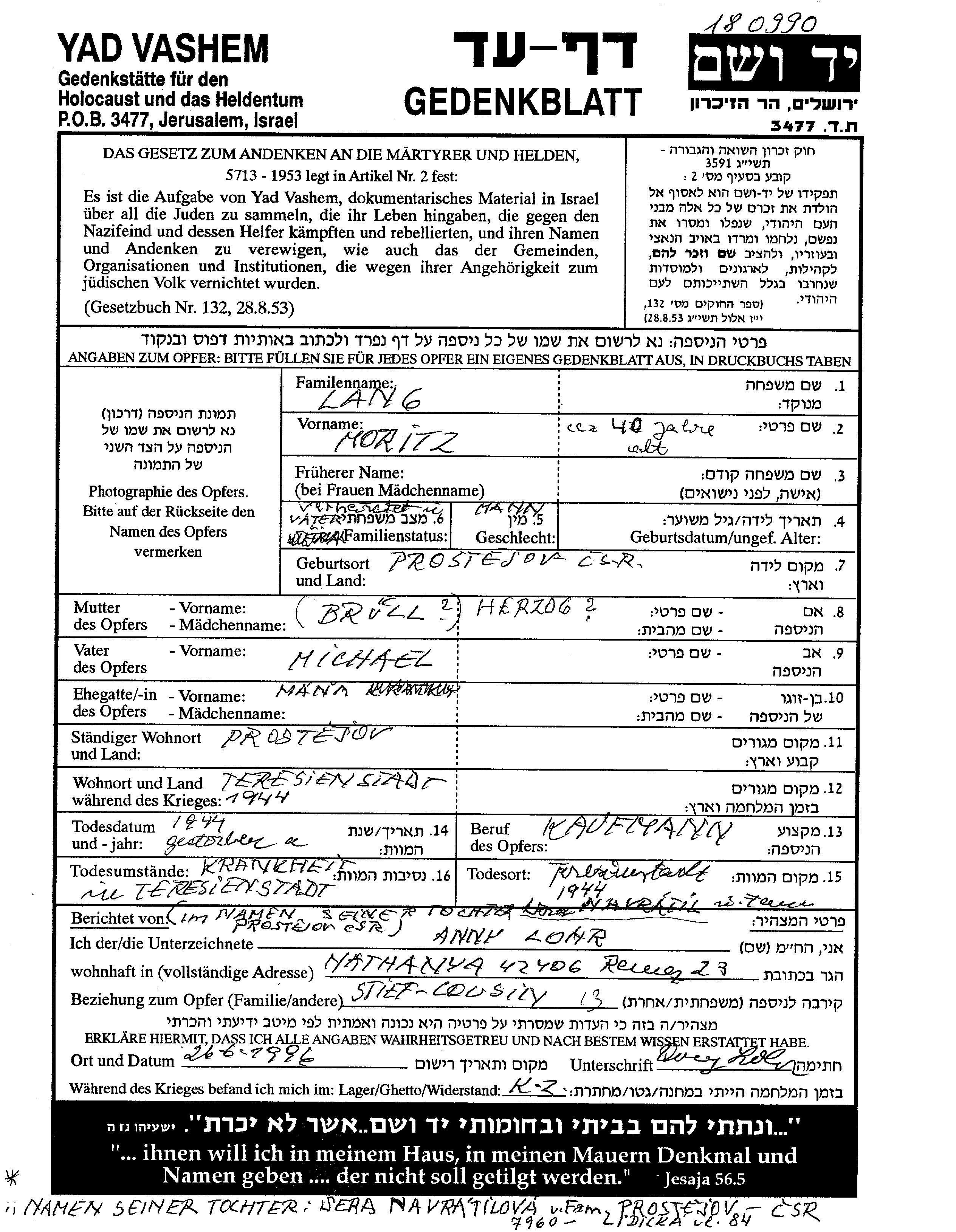 Moritz Lang wurde im Jahr 1904 in Prostejov, Tschechoslowakei geboren. Er war der Sohn von Michael. Er war Kaufmann/-frau und mit Mania Verheiratet. Vor dem Zweiten Weltkrieg lebte er in Prostejov, Tschechoslowakei. Während des Krieges war er in Tschechoslowakei.