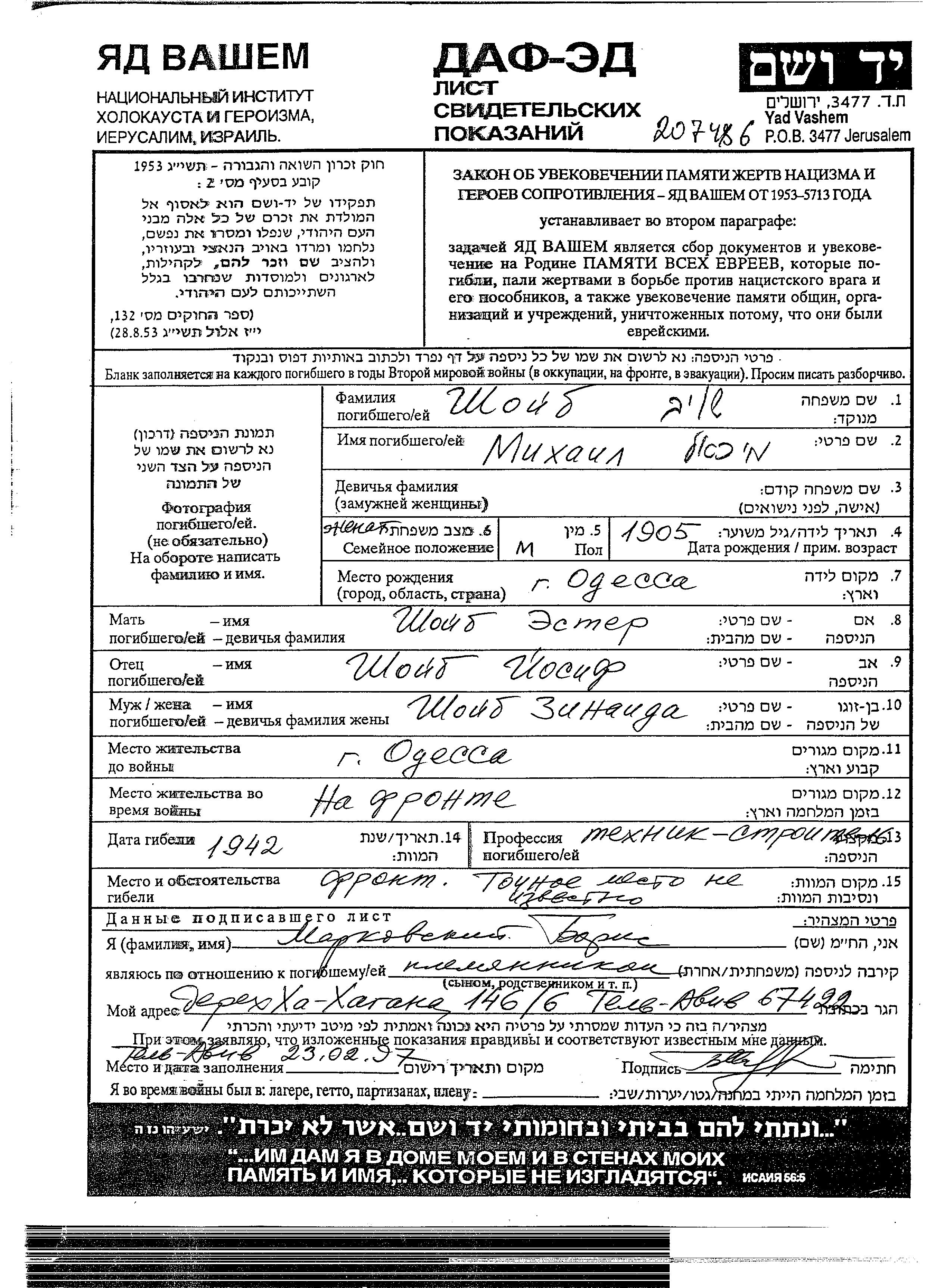 Mikhail Shoib Shvib wurde im Jahr 1905 in Odessa, Ukraine (UdSSR) geboren. Er war der Sohn von Yosif und Ester. Er war Musiker/-in und mit Zinaida Verheiratet. Vor dem Zweiten Weltkrieg lebte er in Odessa, Ukraine (UdSSR). Während des Krieges war er in die Sowjetischen Streitkräfte. Mikhail im Militärdienst umgekommen. Todesort: unbekannt im Jahr 1942.
