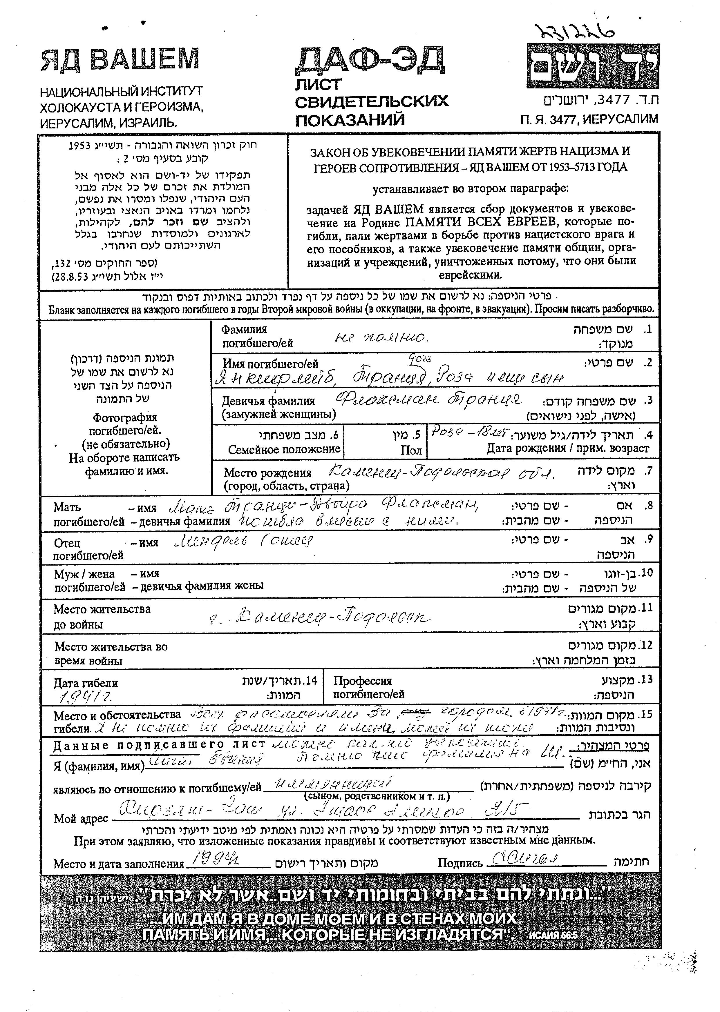 Roza wurde in der Schoah ermordet. Todesort: Kamenets Podolskiy, Ukraine (UdSSR) im Jahr 1941.