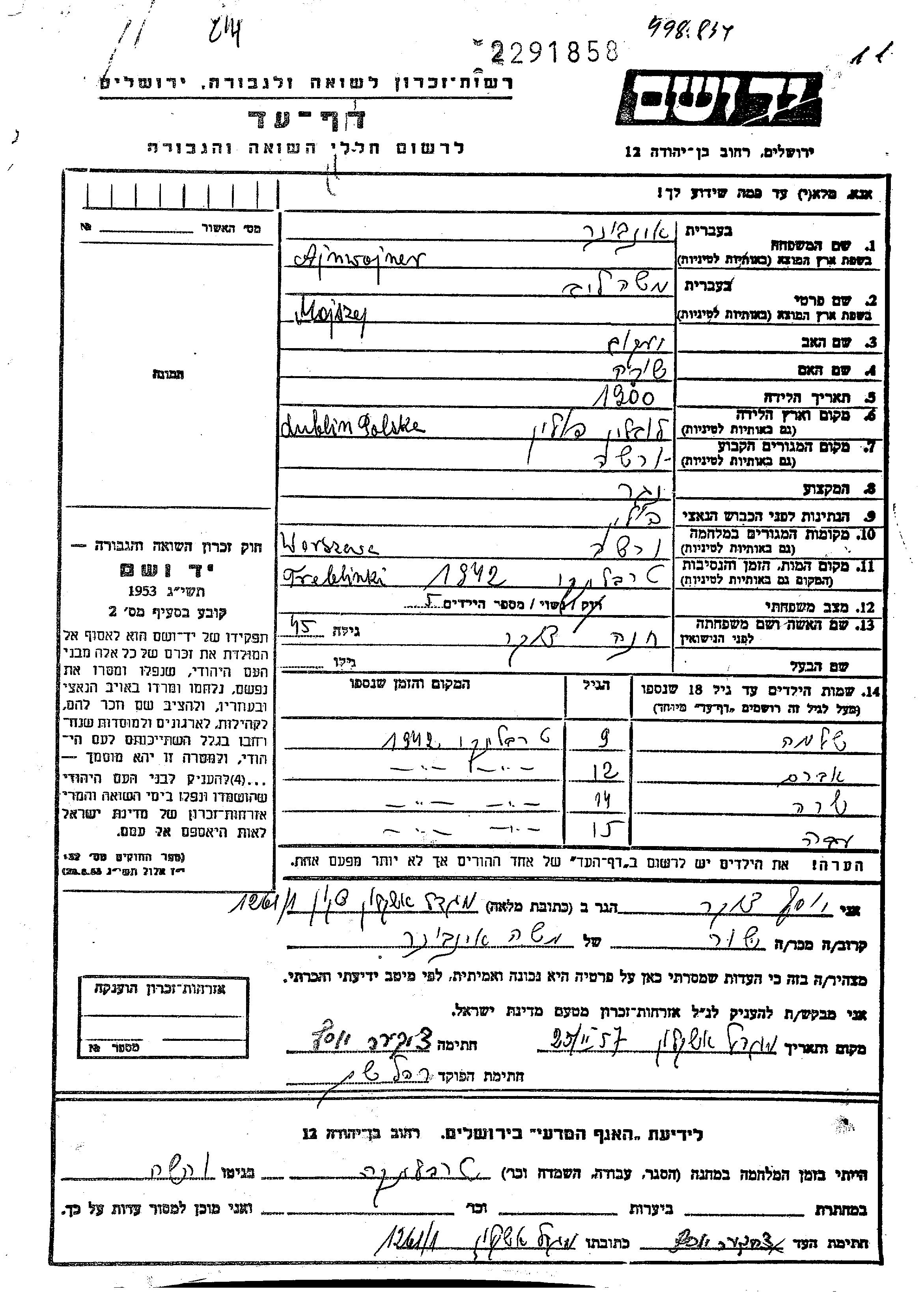 Mojszy Leib Ajnwojner wurde im Jahr 1900 in Lublin, Polen geboren. Er war der Sohn von Yaakov und Shura. Er war Zimmermann und mit Khana Verheiratet. Vor dem Zweiten Weltkrieg lebte er in Warszawa, Polen. Während des Krieges war er in Warszawa, Polen.