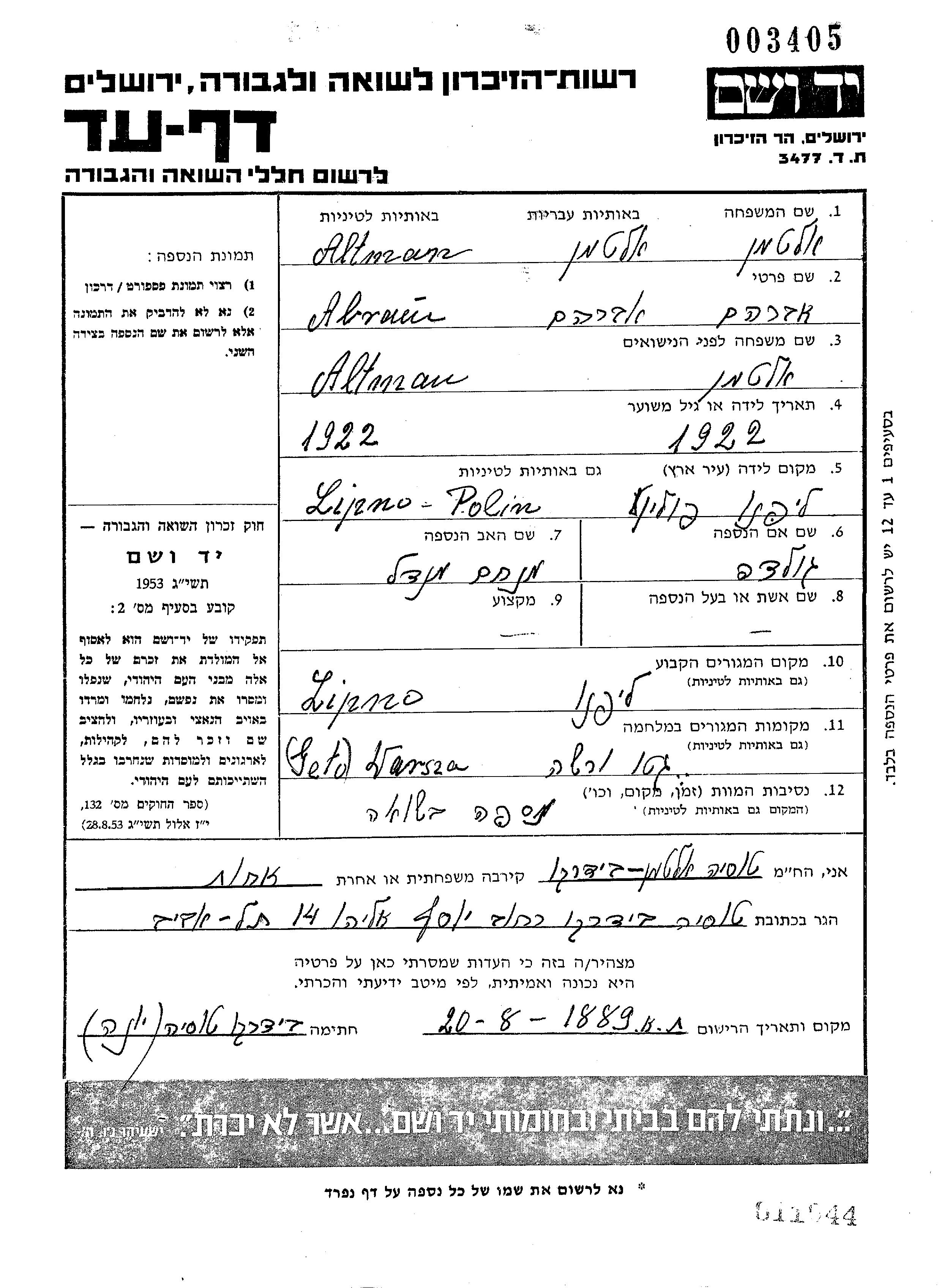 Altman Abram 1922 Lipno, Polen Gedenkblatt