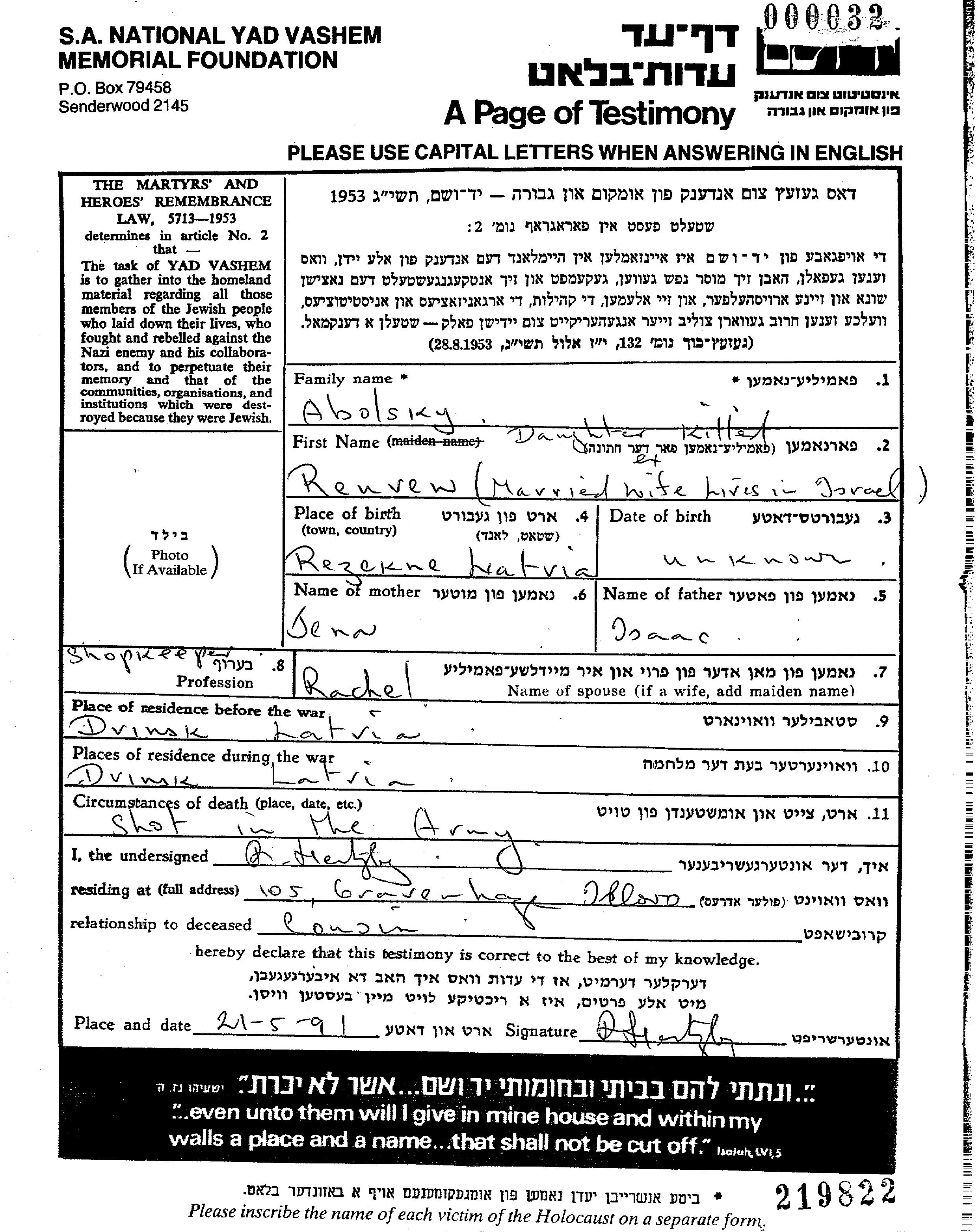 Reuven Abolsky Abolski wurde in Rēzekne, Lettland geboren. Er war der Sohn von Isaak und Jena Yana, geb. Rotshtein. Er war Ladenbesitzer/-in und mit Rachel Verheiratet. Vor dem Zweiten Weltkrieg lebte er in Dvinsk, Lettland. Während des Krieges war er in die Sowjetischen Streitkräfte.
