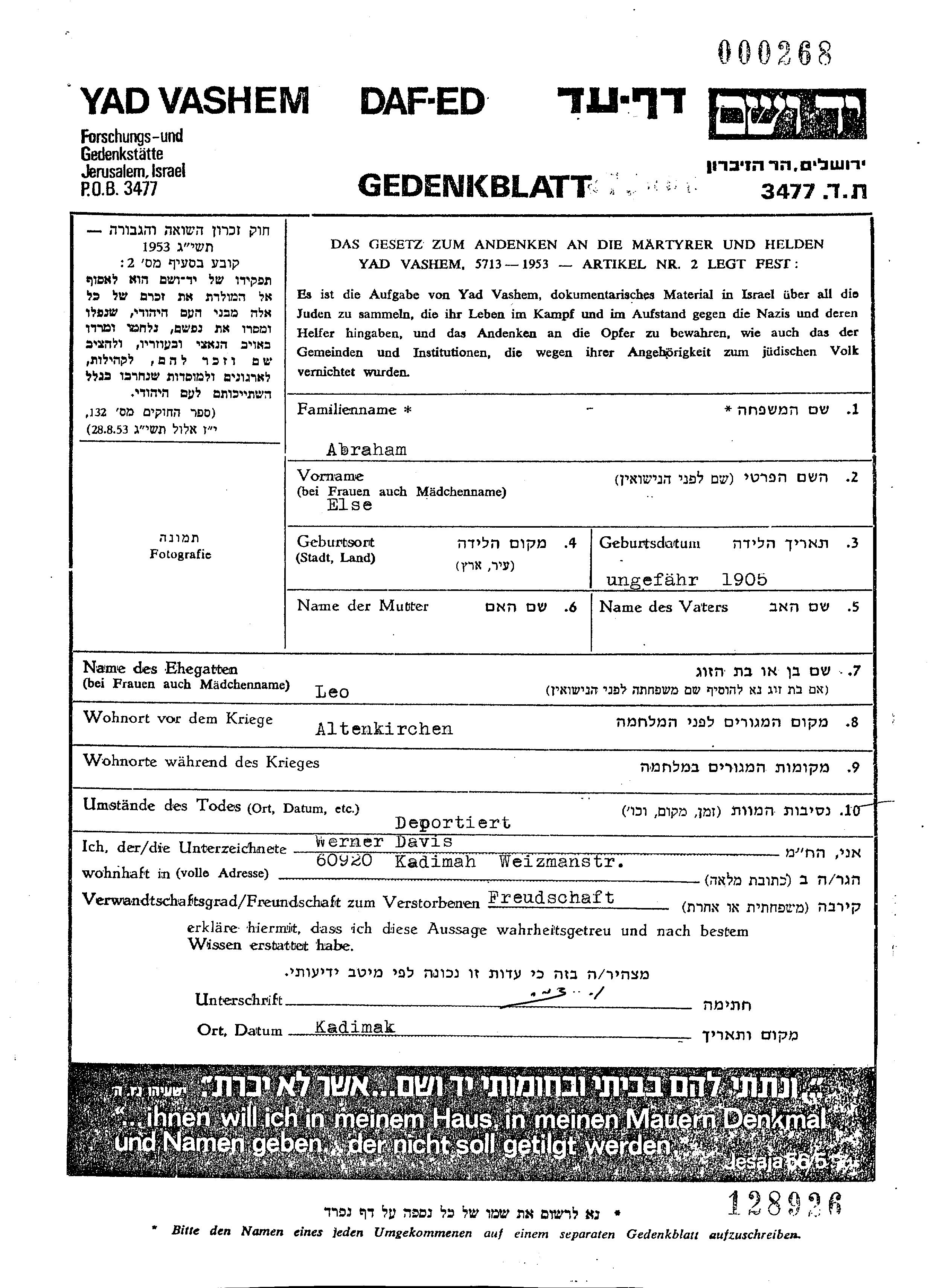 Else Abraham wurde im Jahr 1905 geboren. Sie war mit Leo Verheiratet. Vor dem Zweiten Weltkrieg lebte sie in Altenkirchen, Deutsches Reich.