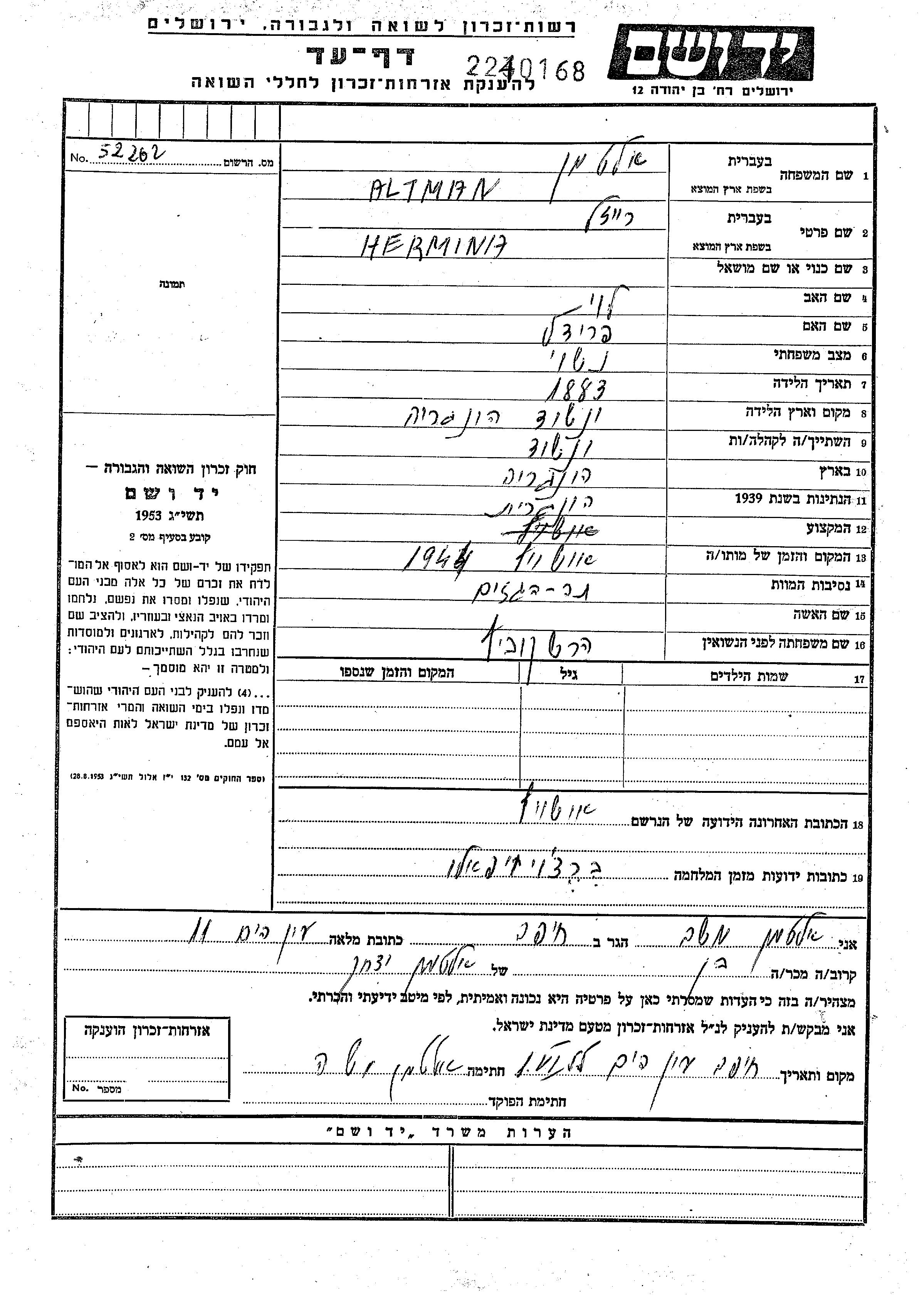 Raizel Hermina Altman, geb. Hershkovich wurde im Jahr 1883 in Janoshida, Ungarn geboren. Sie war die Tochter von Levie und Freidel Freidel. Sie war mit Ytzkhak Ignatz Verheiratet. Vor dem Zweiten Weltkrieg lebte sie in Janoshida, Ungarn. Während des Krieges war sie in Told, Ungarn.