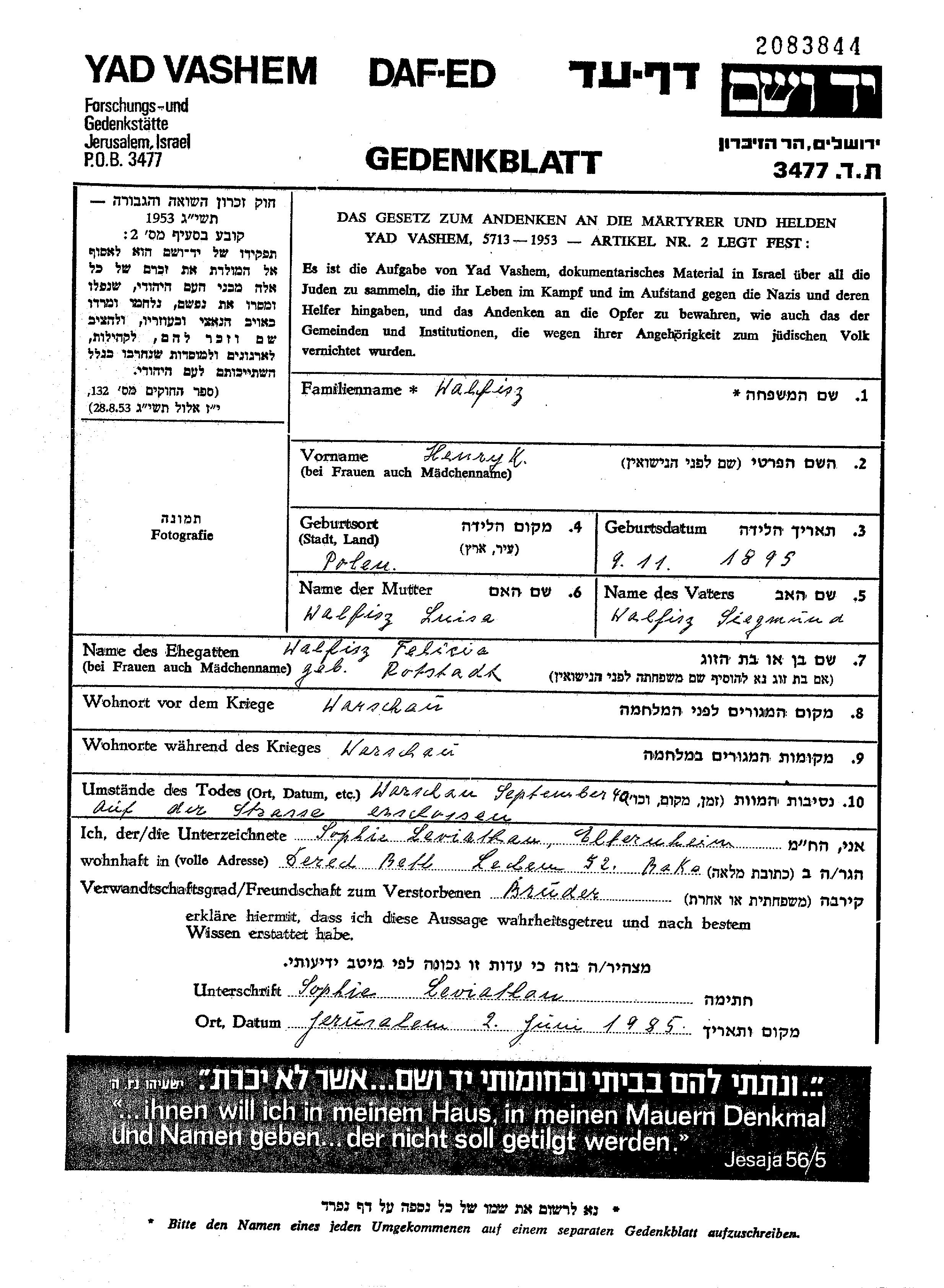 Walfisz Henryk 1899 Warszawa, Polen Gedenkblatt