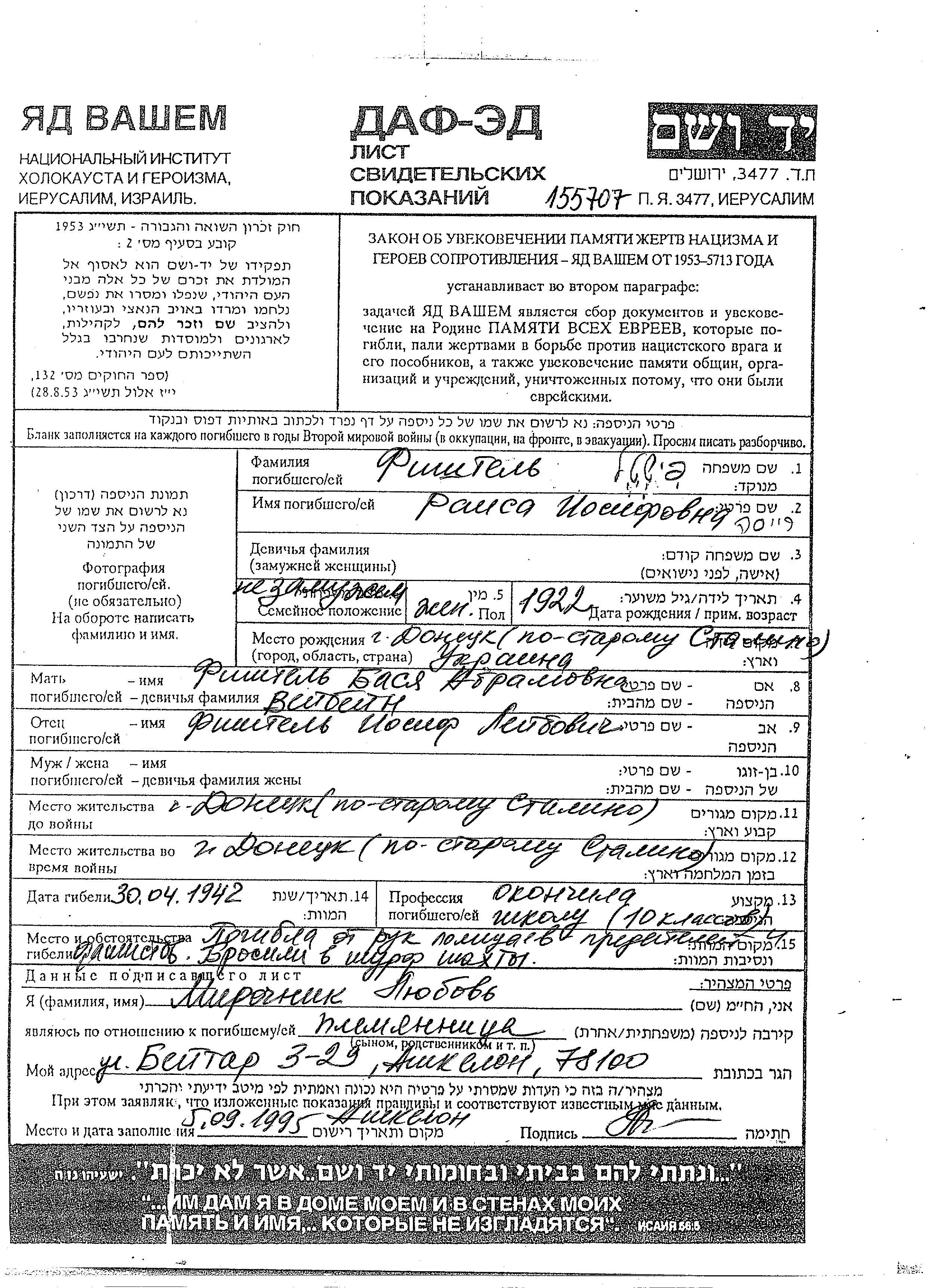 Raisa Fishtel wurde im Jahr 1922 in Stalino, Ukraine (UdSSR) geboren. Sie war die Tochter von Iosif und Basia, geb. Veisbein. Sie war Ledig. Vor dem Zweiten Weltkrieg lebte sie in Stalino, Ukraine (UdSSR). Während des Krieges war sie in Stalino, Ukraine (UdSSR).