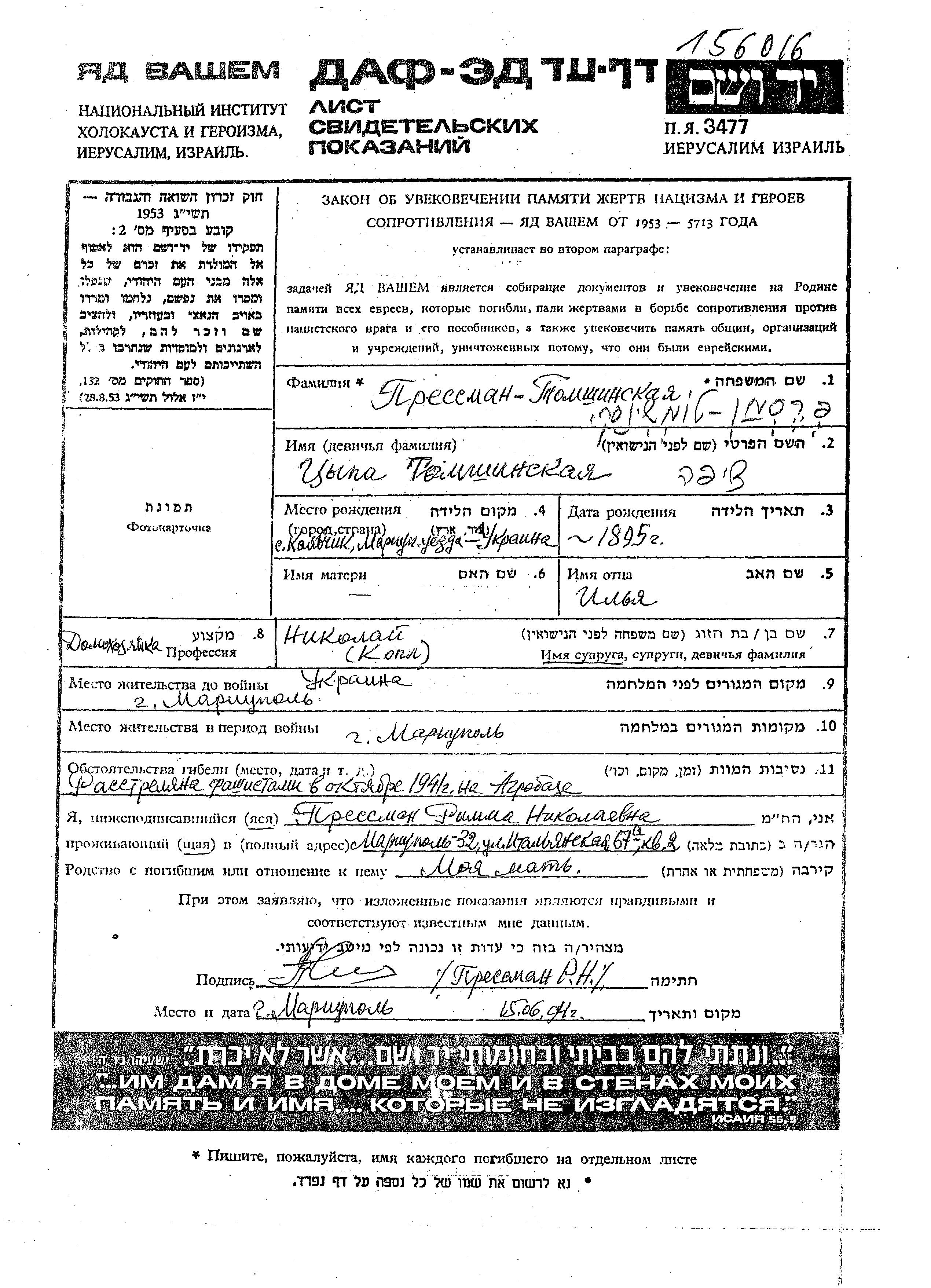 Tzipa Tomshinski Presman, geb. Tomshinski wurde im Jahr 1895 in Kalchik, Ukraine (UdSSR) geboren. Sie war die Tochter von Ilia. Sie war Hausfrau und mit Nikolai Kopl Verheiratet. Vor dem Zweiten Weltkrieg lebte sie in Mariupol, Ukraine (UdSSR). Während des Krieges war sie in Mariupol, Ukraine (UdSSR).