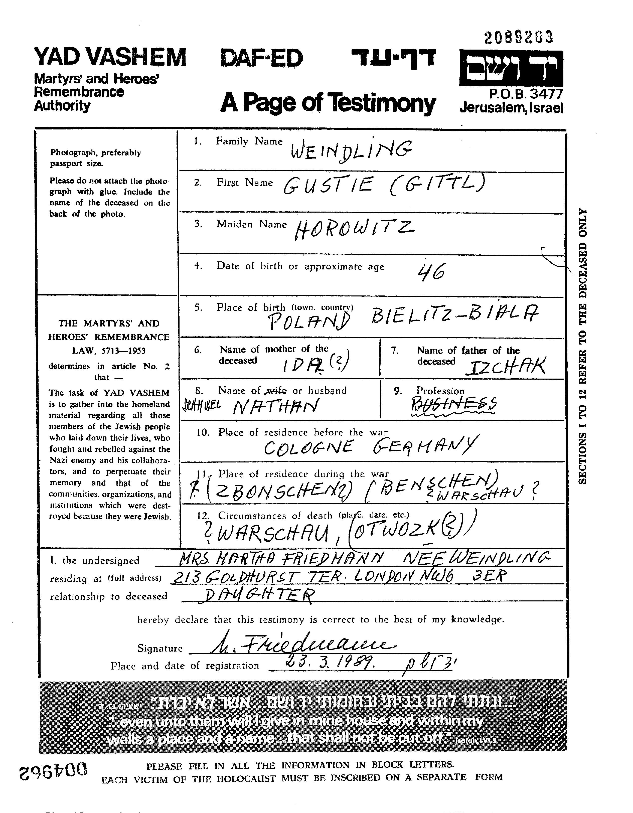 Gustie Gittl Weindling, geb. Horowitz wurde in Bielitz Biala, Polen geboren. Sie war die Tochter von Izchak und Ida. Sie war mit Schmuel Nathan Verheiratet. Vor dem Zweiten Weltkrieg lebte sie in Cologne, Deutsches Reich. Während des Krieges war sie in Bentschen, Polen.