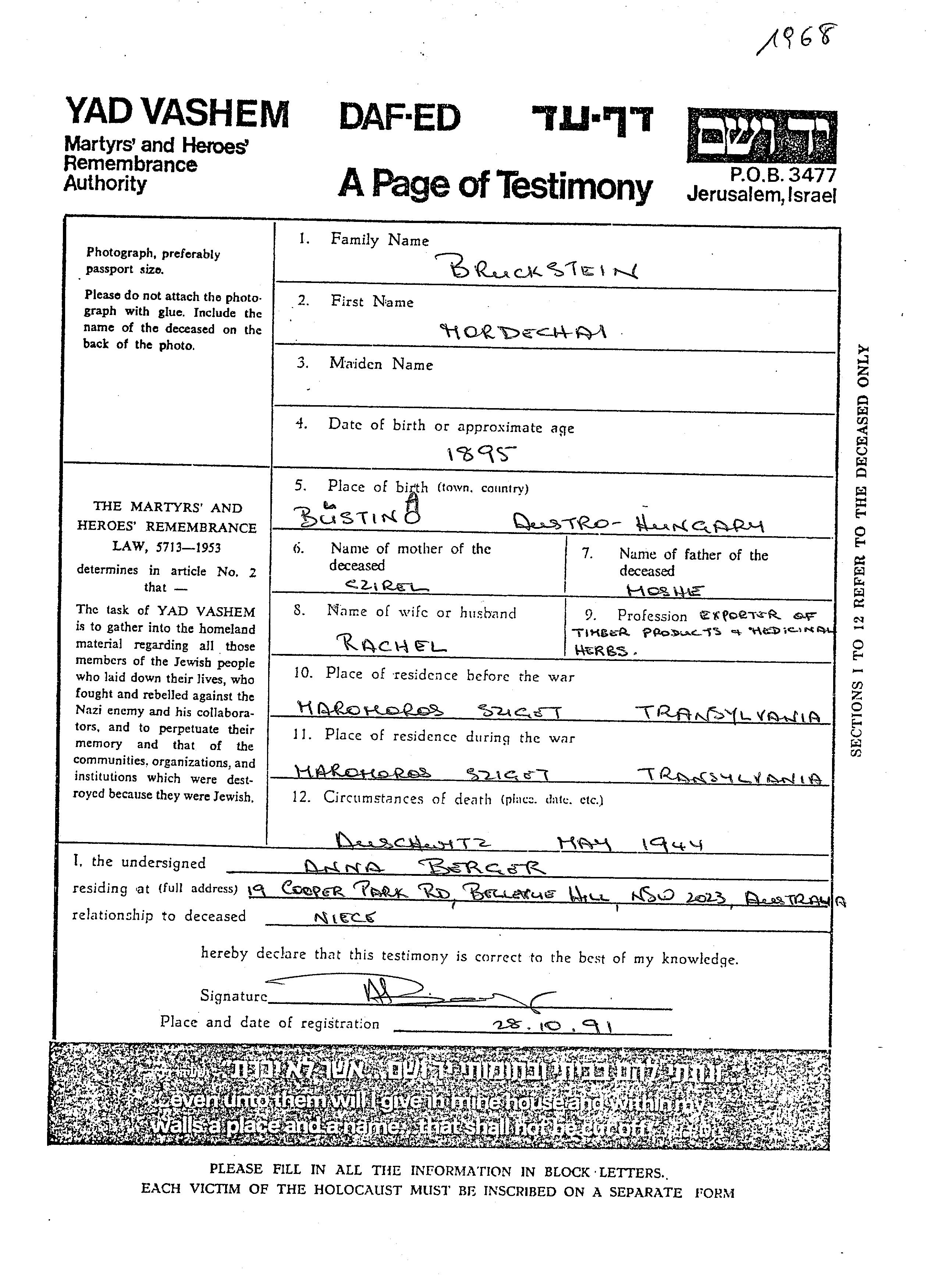 Mordechai Bruckstein wurde im Jahr 1895 in Bustina, Tschechoslowakei geboren. Er war der Sohn von Moshe und Czirel. Er war Kaufmann/-frau und mit Rachel Verheiratet. Vor dem Zweiten Weltkrieg lebte er in Maramarossziget, Rumänien. Während des Krieges war er in Maramarossziget, Rumänien.