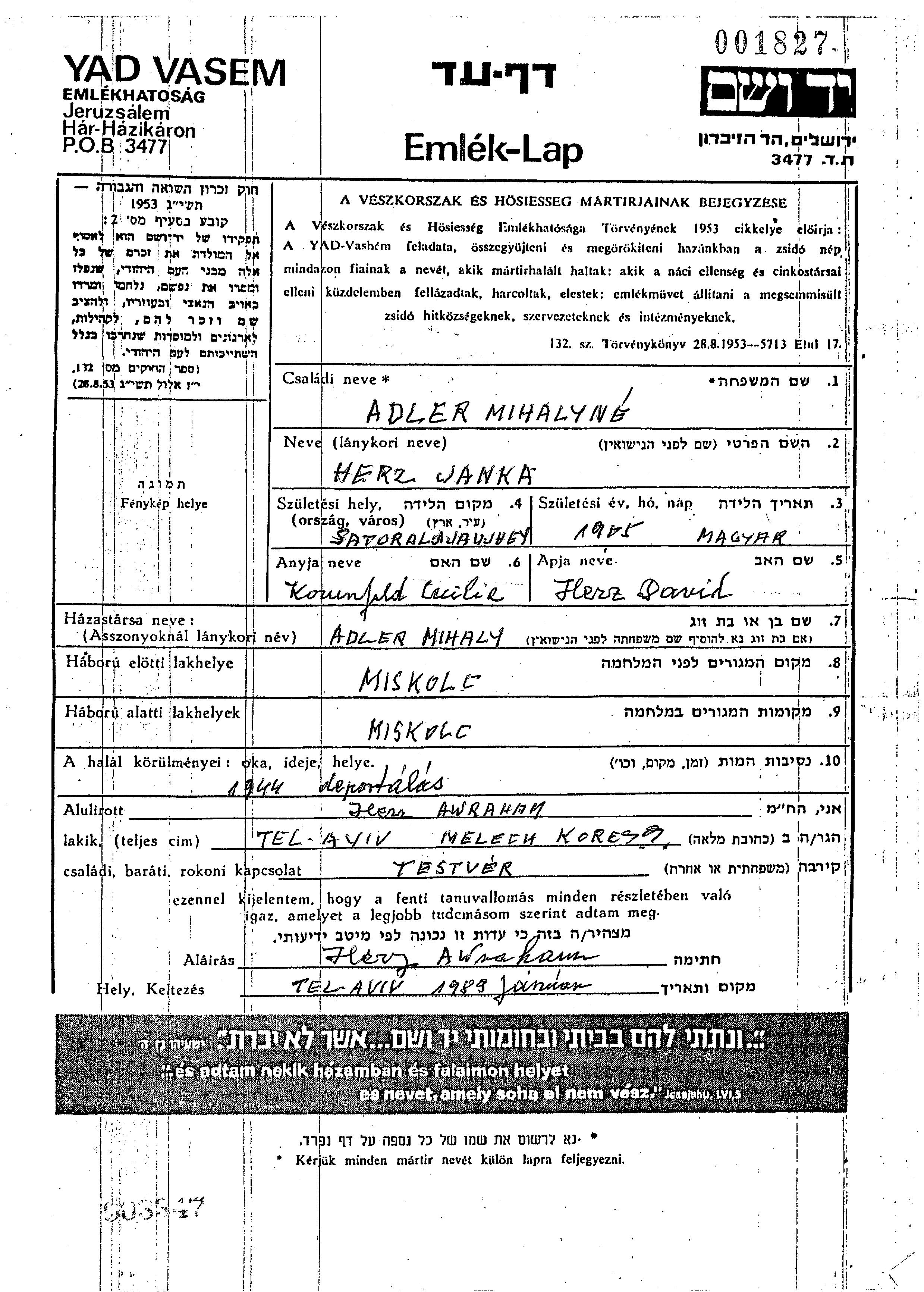 Janka Adler, geb. Herz wurde im Jahr 1905 in Satoraljaujhely, Ungarn geboren. Sie war die Tochter von David und Cecilia, geb. Korunfeld. Sie war mit Mihaly Verheiratet. Vor dem Zweiten Weltkrieg lebte sie in Miskolc, Ungarn. Während des Krieges war sie in Miskolc, Ungarn.