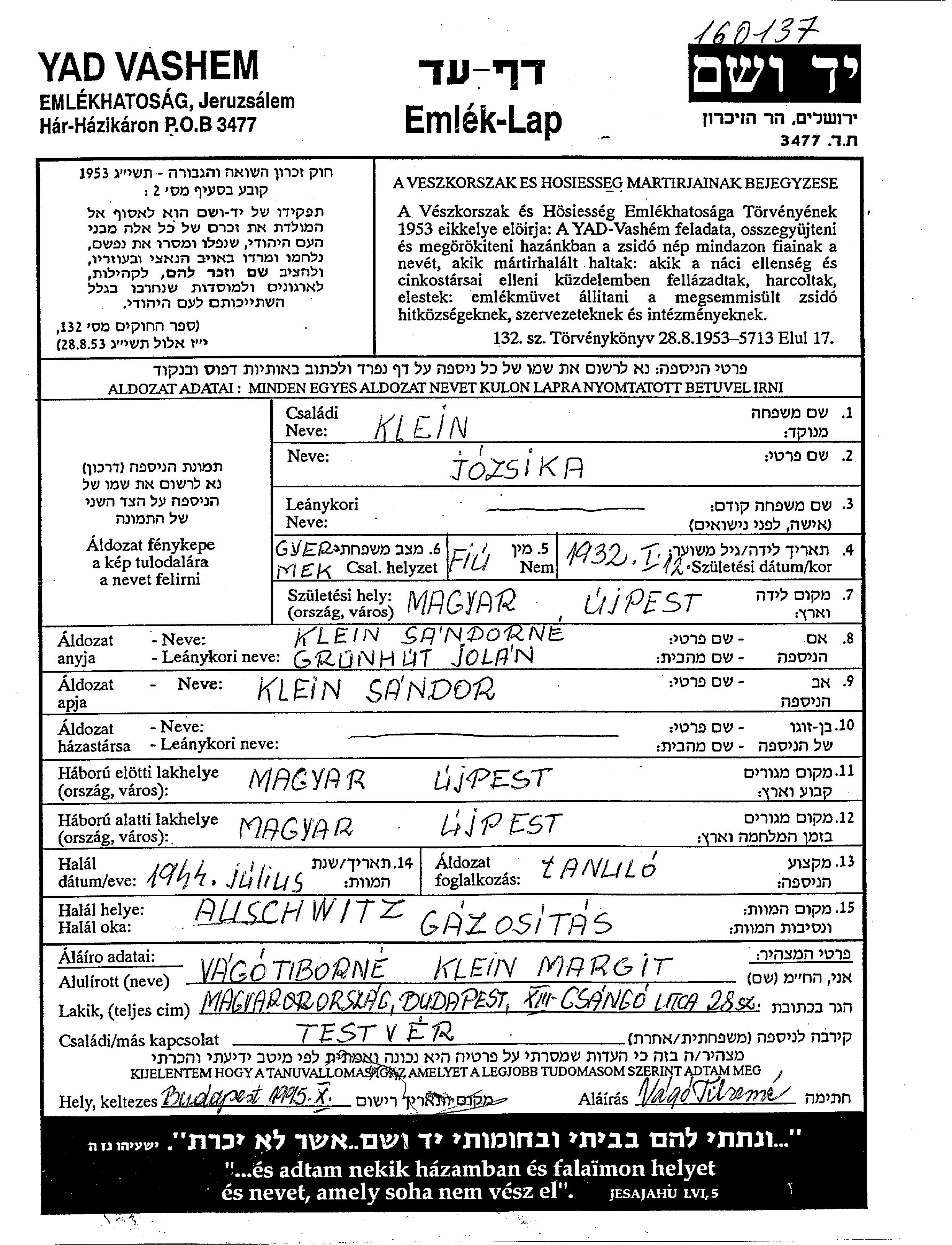 Jozsika Klein wurde im Jahr 1932 in Ujpest, Ungarn geboren. Er war der Sohn von Sandor und Jolan, geb. Grünhut. Er war Schüler/-in und Kind. Vor dem Zweiten Weltkrieg lebte er in Ujpest, Ungarn. Während des Krieges war er in Ujpest, Ungarn.