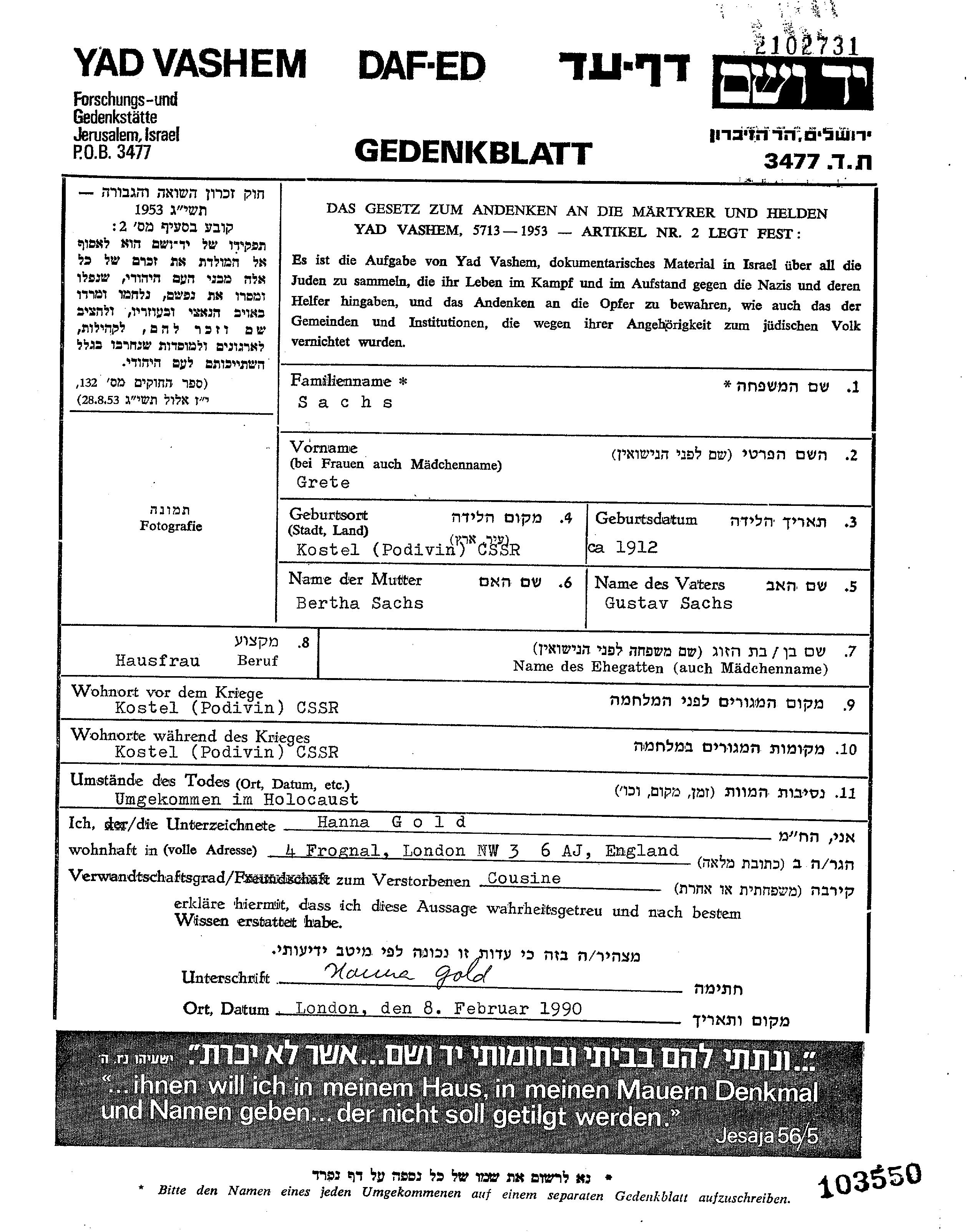 Grete Sachs wurde in Kostel, Tschechoslowakei geboren. Sie war die Tochter von Gustav und Bertha, geb. Sachs. Sie war Hausfrau. Vor dem Zweiten Weltkrieg lebte sie in Kostel, Tschechoslowakei. Während des Krieges war sie in Kostel, Tschechoslowakei.