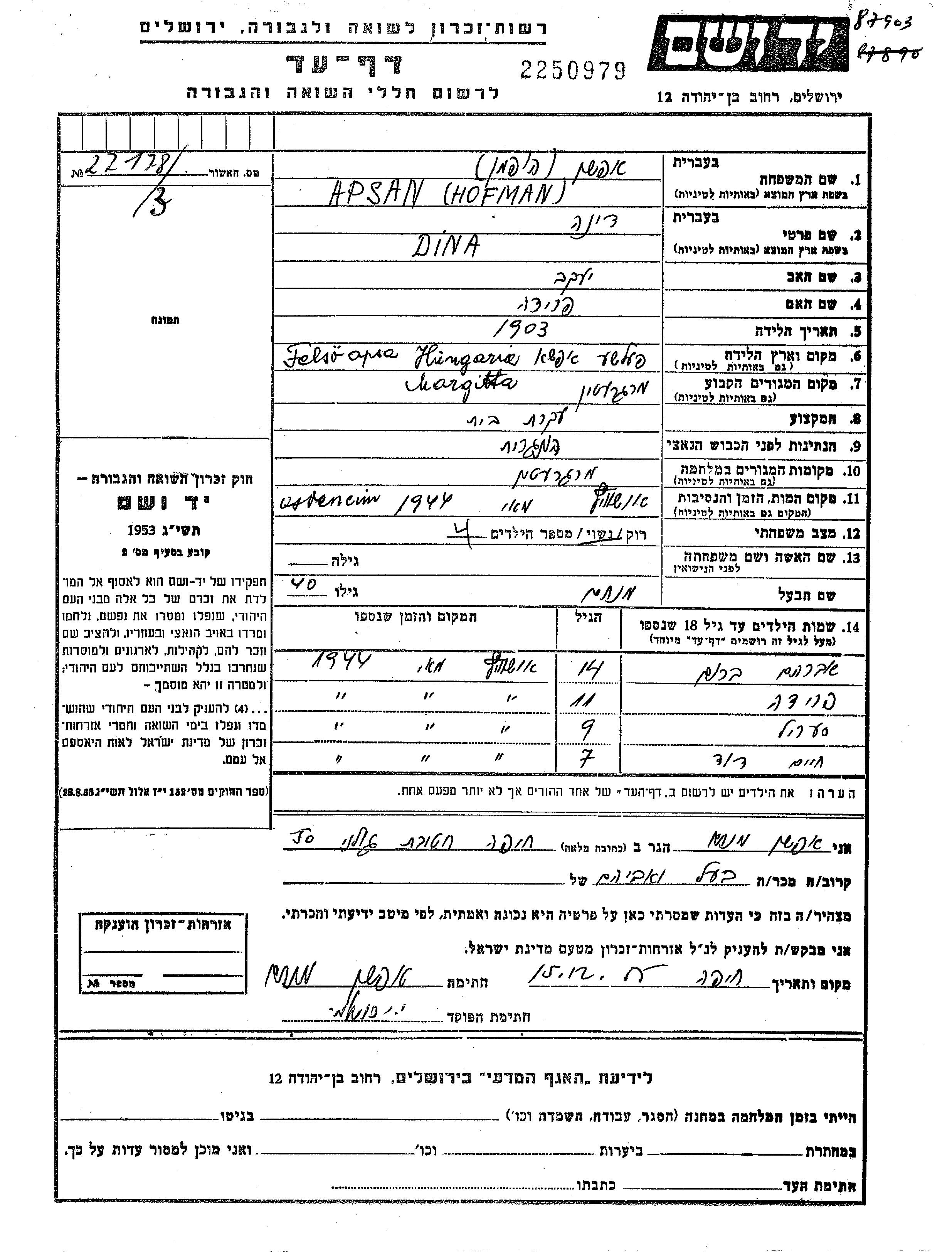 Dina Apsan, geb. Hofman wurde im Jahr 1903 in Vysna Apsa, Tschechoslowakei geboren. Sie war die Tochter von Yaakov und Frida. Sie war Hausfrau und mit Menakhem Verheiratet. Vor dem Zweiten Weltkrieg lebte sie in Margitta, Rumänien. Während des Krieges war sie in Margareten, Rumänien.