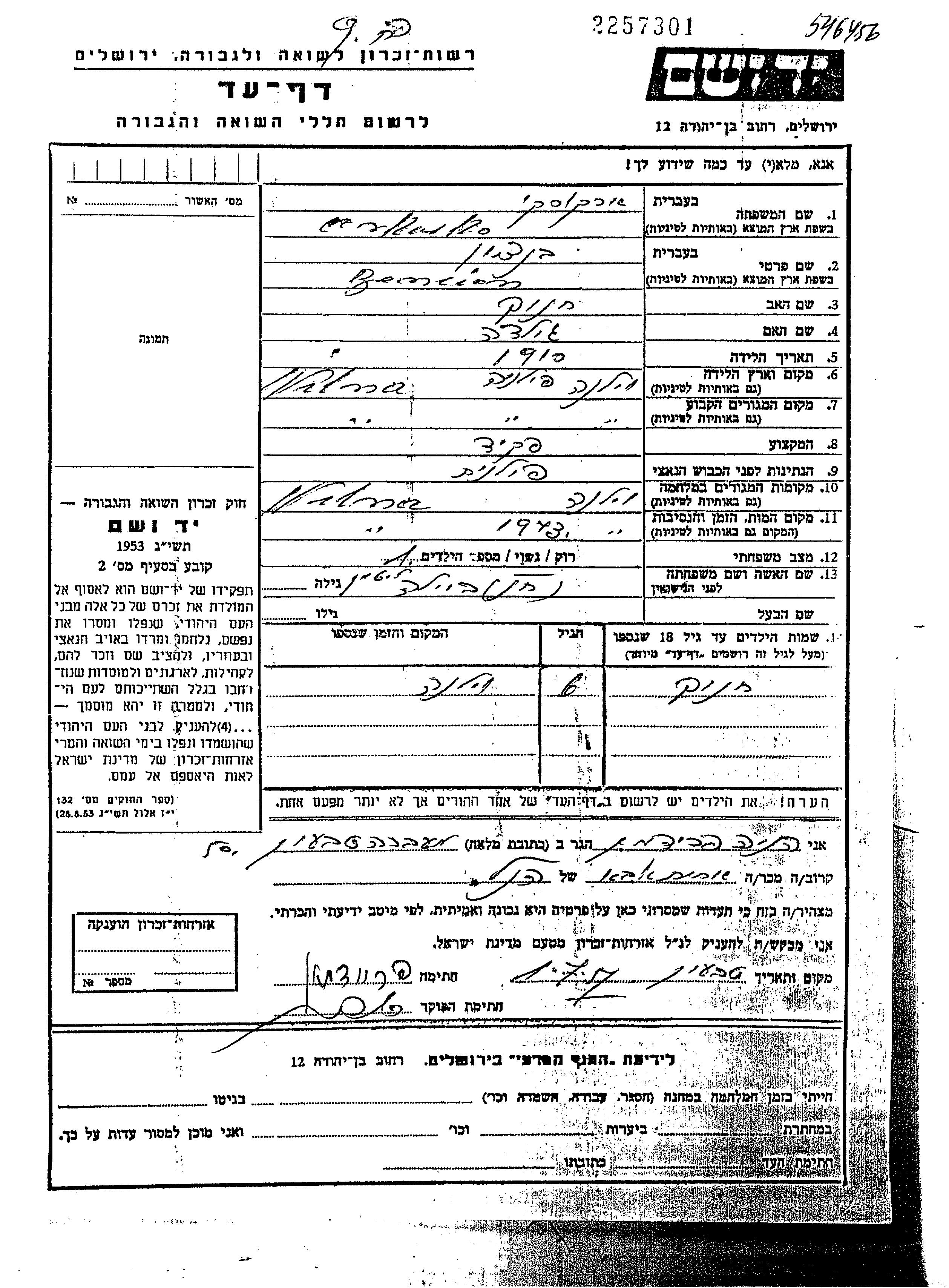 Bencion Arkoski wurde im Jahr 1910 in Wilna, Polen geboren. Er war der Sohn von Khanokh und Golda. Er war Angestellte/-r und mit Khani Beila, geb. Litman Verheiratet. Vor dem Zweiten Weltkrieg lebte er in Wilna, Polen. Während des Krieges war er in Wilna, Polen.