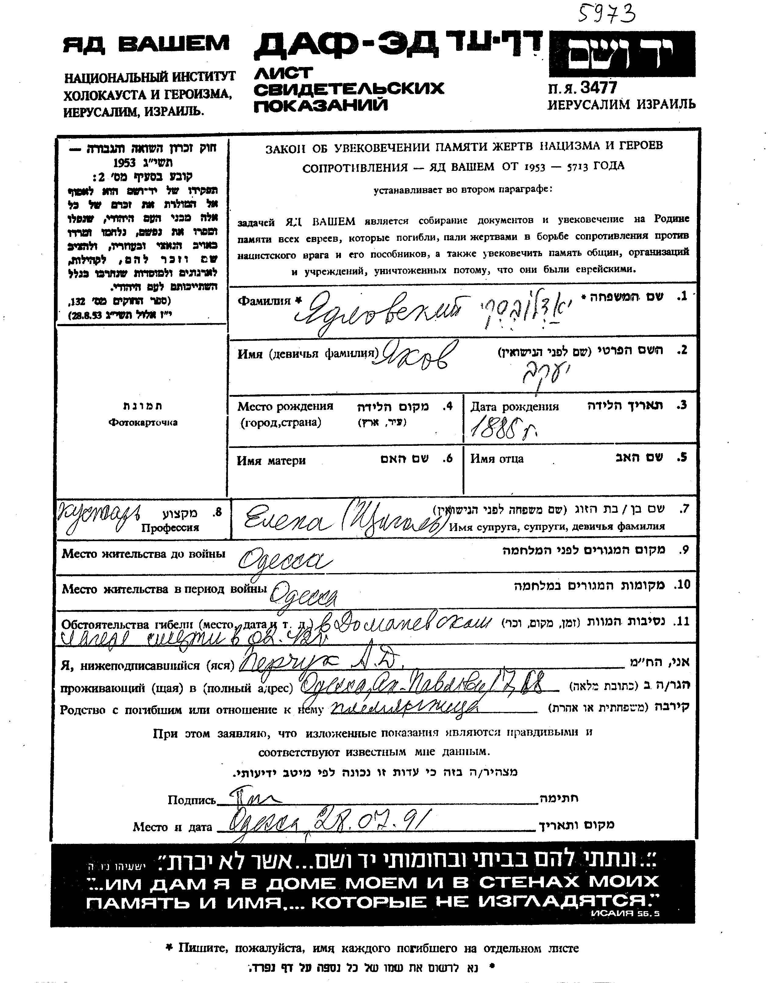 Yaakov Yadlovski wurde im Jahr 1885 geboren. Er war Arbeiter/-in und mit Yelena Verheiratet. Vor dem Zweiten Weltkrieg lebte er in Odessa, Ukraine (UdSSR). Während des Krieges war er in Odessa, Ukraine (UdSSR).