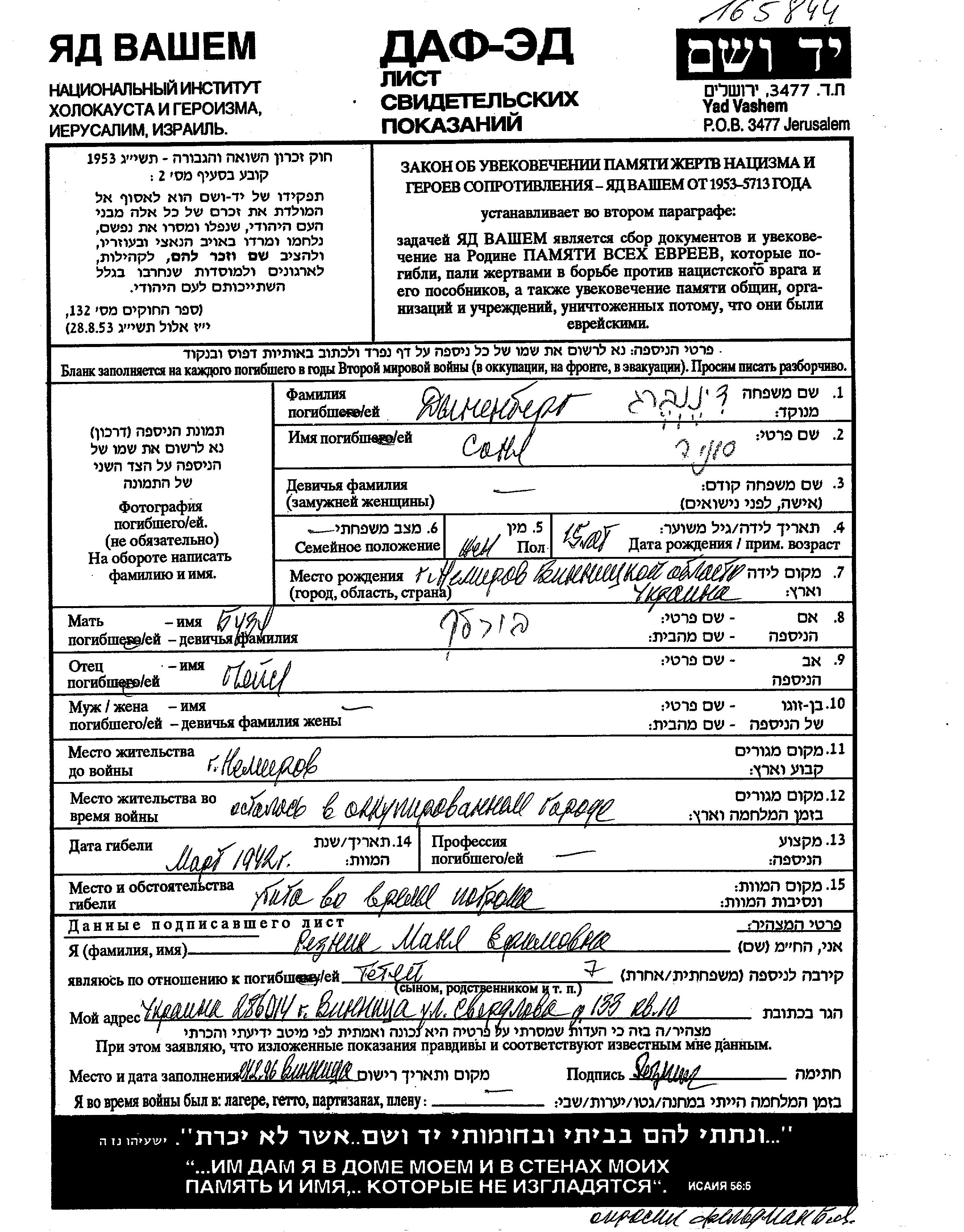 Dynenberg Sonia 1927 Nemirov, Ukraine (UdSSR) Gedenkblatt