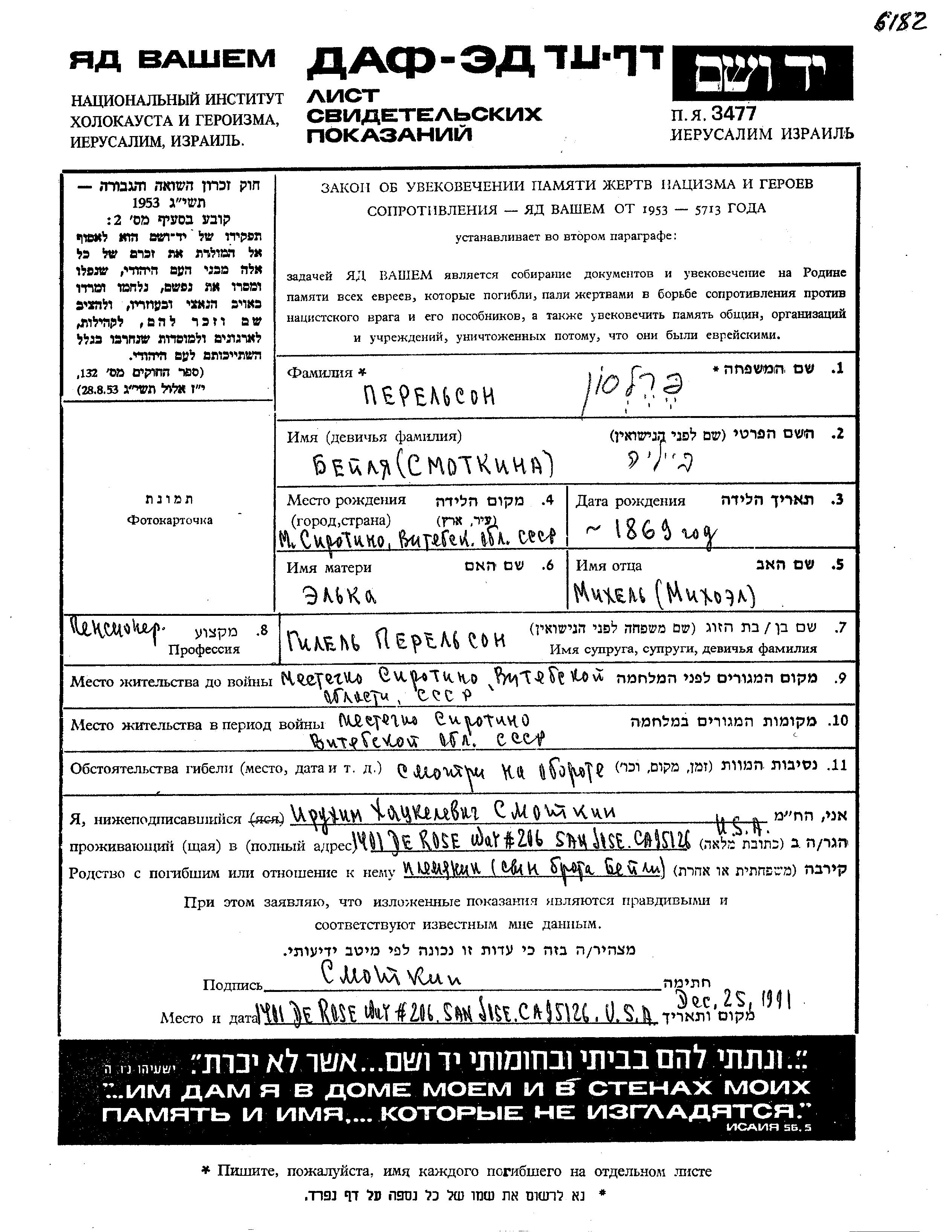 Beilia Perelson, geb. Smotkin wurde im Jahr 1869 in Sirotino, Weißrussland (UdSSR) geboren. Sie war die Tochter von Mikhel und Elka. Sie war Rentner/-in und mit Hilel Verheiratet. Vor dem Zweiten Weltkrieg lebte sie in Sirotino, Weißrussland (UdSSR). Während des Krieges war sie in Sirotino, Weißrussland (UdSSR).