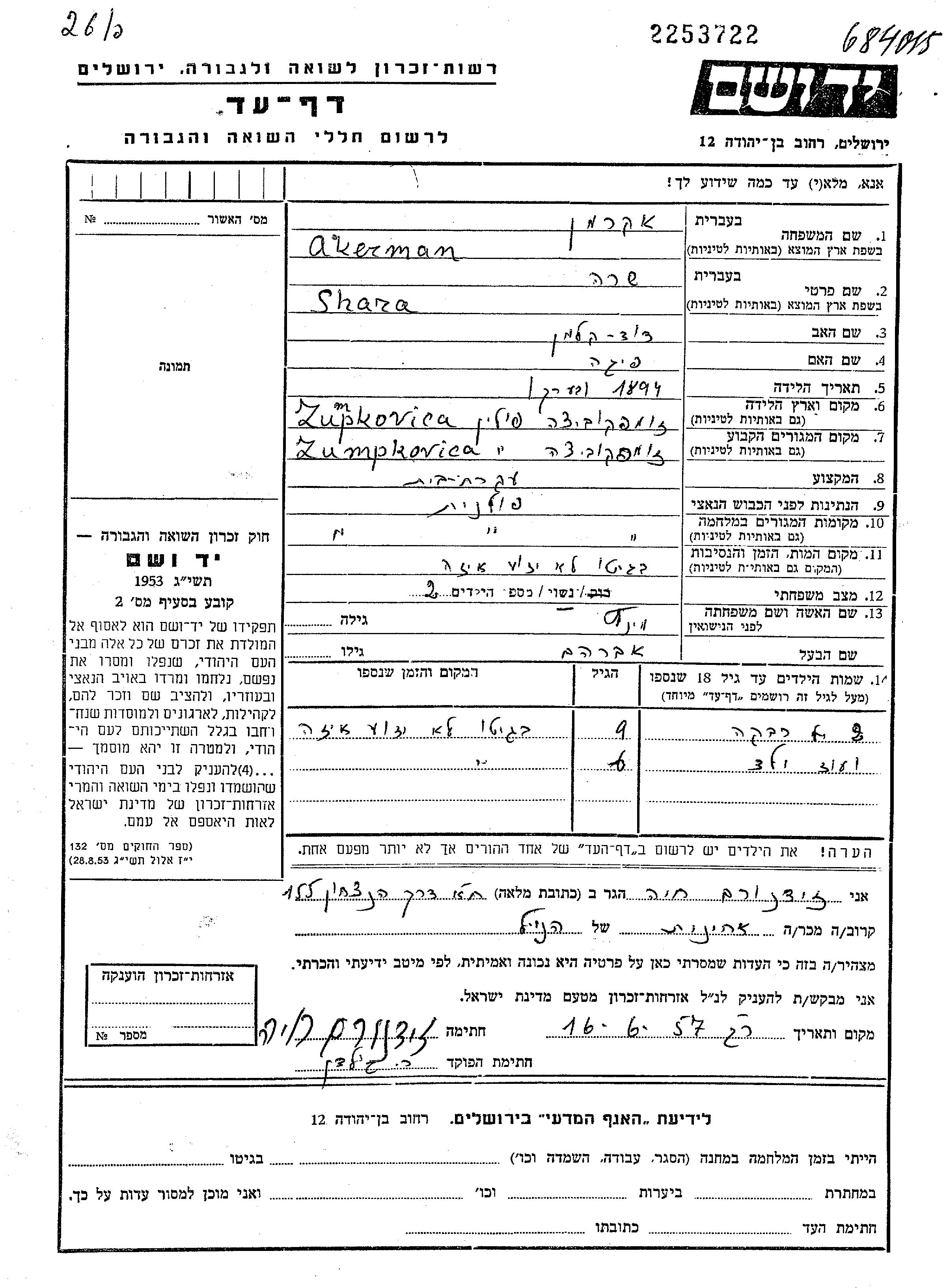 Shara Akerman, geb. Mintz wurde im Jahr 1894 in Zompkovica, Polen geboren. Sie war die Tochter von David Kalman und Feiga. Sie war Hausfrau und mit Avraham Verheiratet. Vor dem Zweiten Weltkrieg lebte sie in Zompkovica, Polen. Während des Krieges war sie in Zompkovica, Polen.