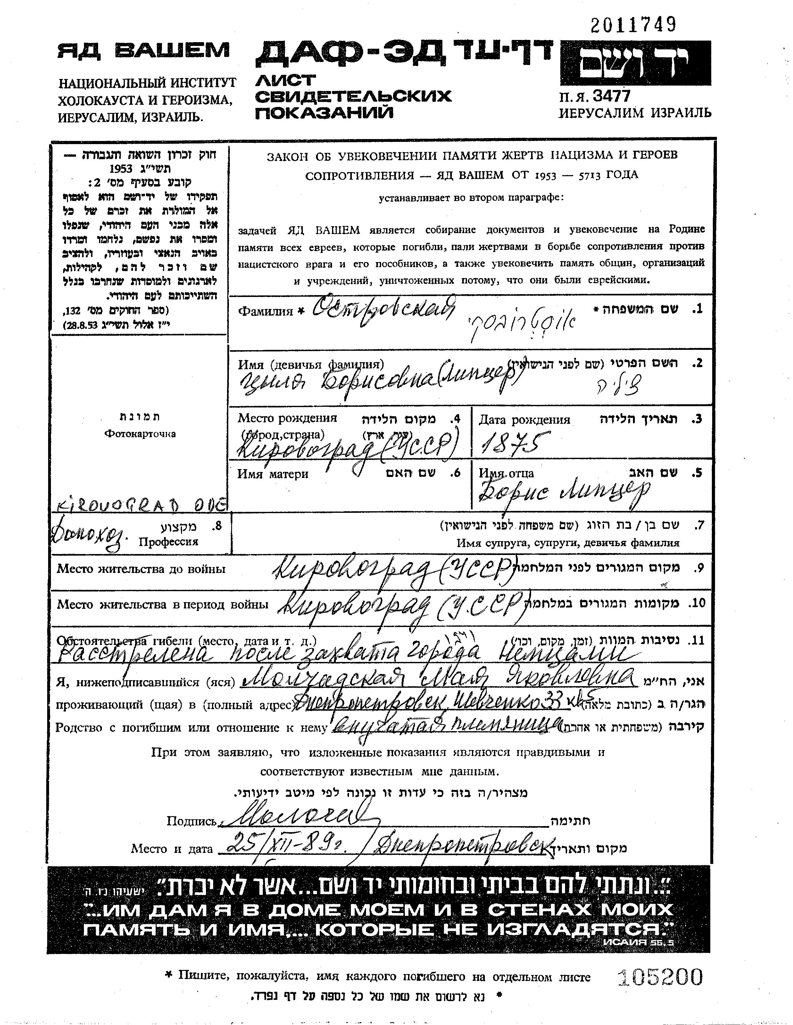 Tzilia Ostrovski, geb. Liptzer wurde im Jahr 1875 in Kirovograd, Ukraine (UdSSR) geboren. Sie war die Tochter von Boris. Sie war Hausfrau und Verheiratet. Vor dem Zweiten Weltkrieg lebte sie in Kirovograd, Ukraine (UdSSR). Während des Krieges war sie in Kirovograd, Ukraine (UdSSR).