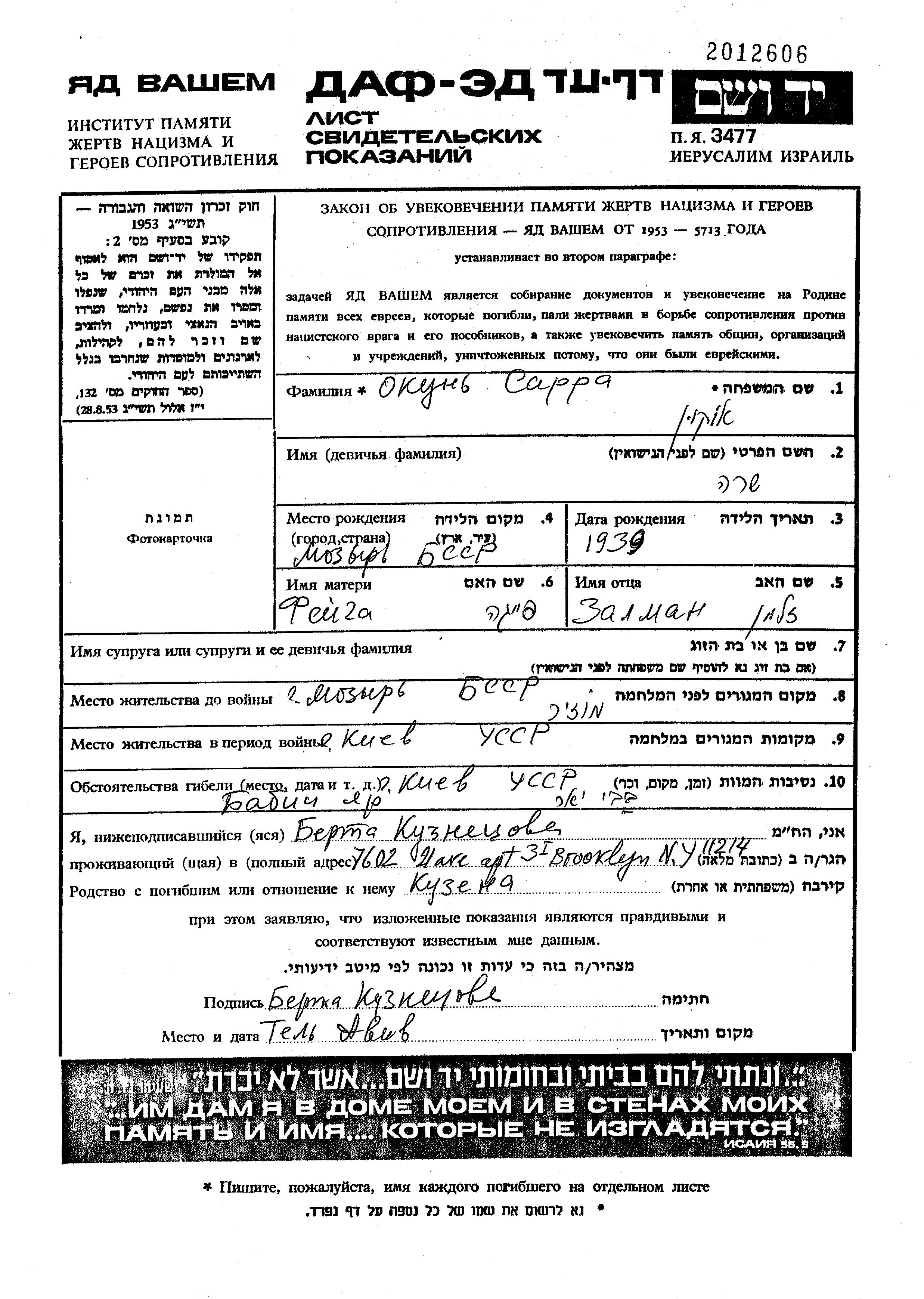 Sara Okun wurde im Jahr 1939 in Mozyr, Weißrussland (UdSSR) geboren. Sie war die Tochter von Zalman und Feiga. Sie war Kind. Vor dem Zweiten Weltkrieg lebte sie in Mozyr, Weißrussland (UdSSR). Während des Krieges war sie in Kiyev, Ukraine (UdSSR).