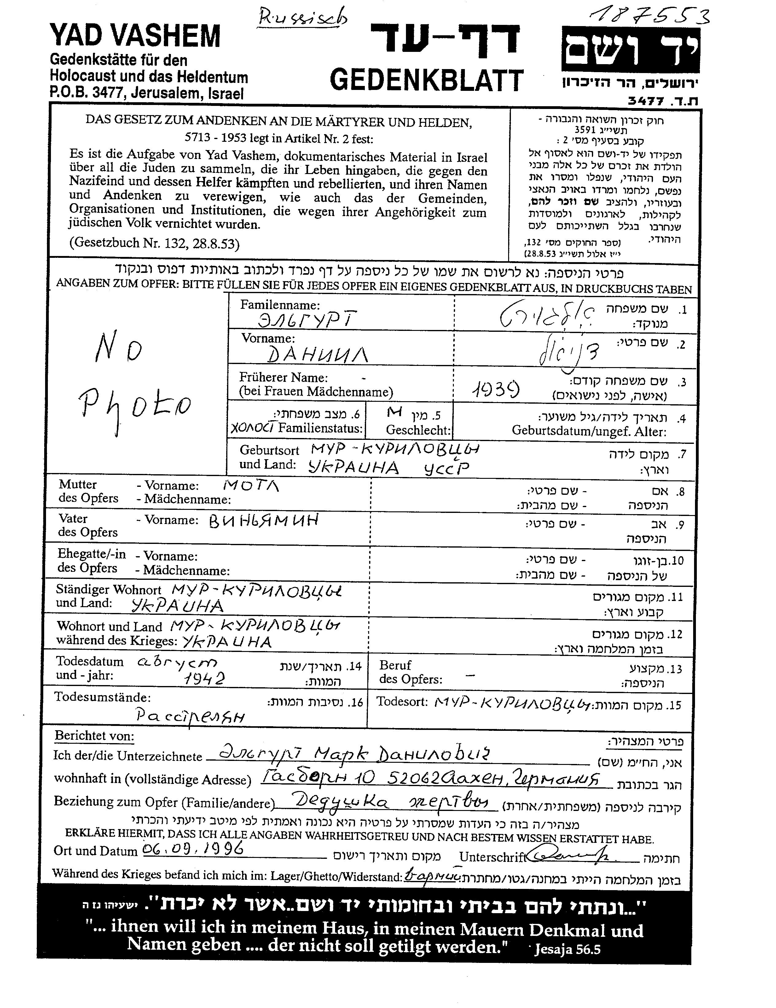 Daniil wurde in der Schoah ermordet. Todesort: Murovanyye Kurilovtsy, Ukraine (UdSSR) im Jahr 1942.
