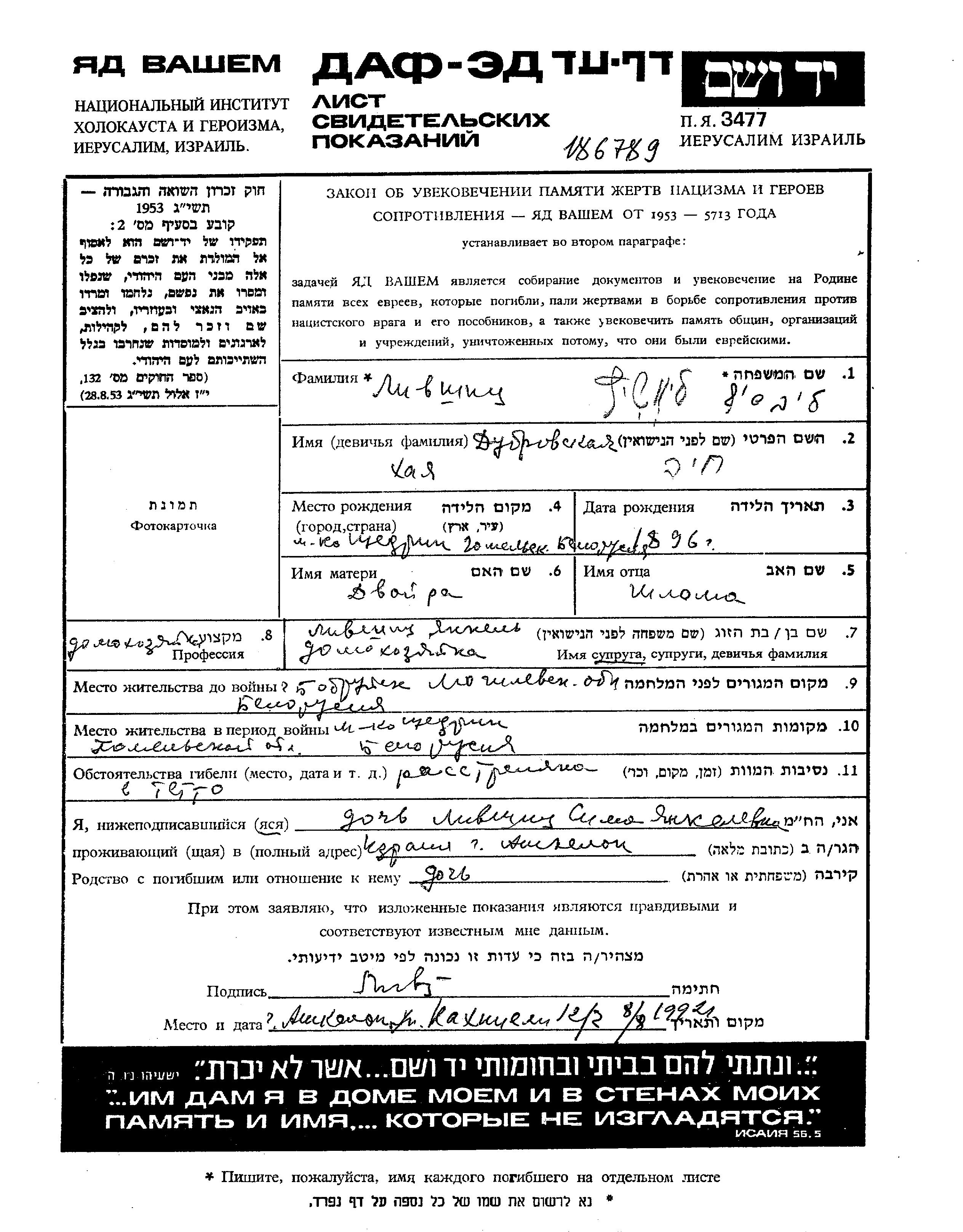 Khaia Livshitz, geb. Dubrovski wurde im Jahr 1896 in Shchedrin, Weißrussland (UdSSR) geboren. Sie war die Tochter von Shloma und Dvoira. Sie war Hausfrau und mit Yankel Verheiratet. Vor dem Zweiten Weltkrieg lebte sie in Bobruysk, Weißrussland (UdSSR). Während des Krieges war sie in Shchedrin, Weißrussland (UdSSR).