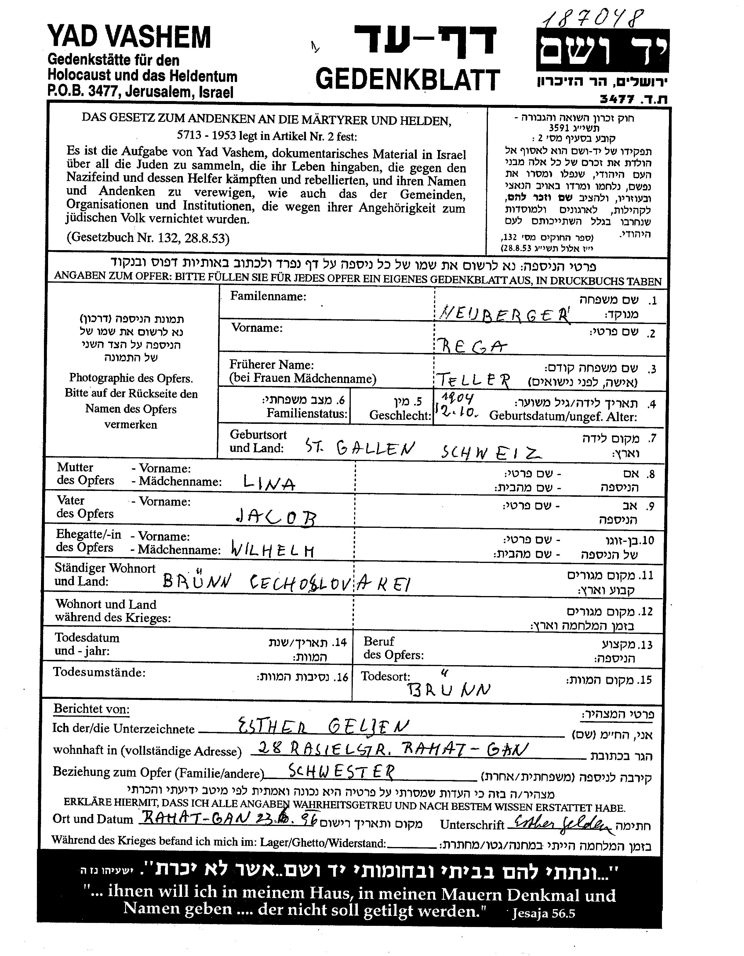 Rega wurde in der Schoah ermordet. Todesort: Bruenn, Tschechoslowakei.