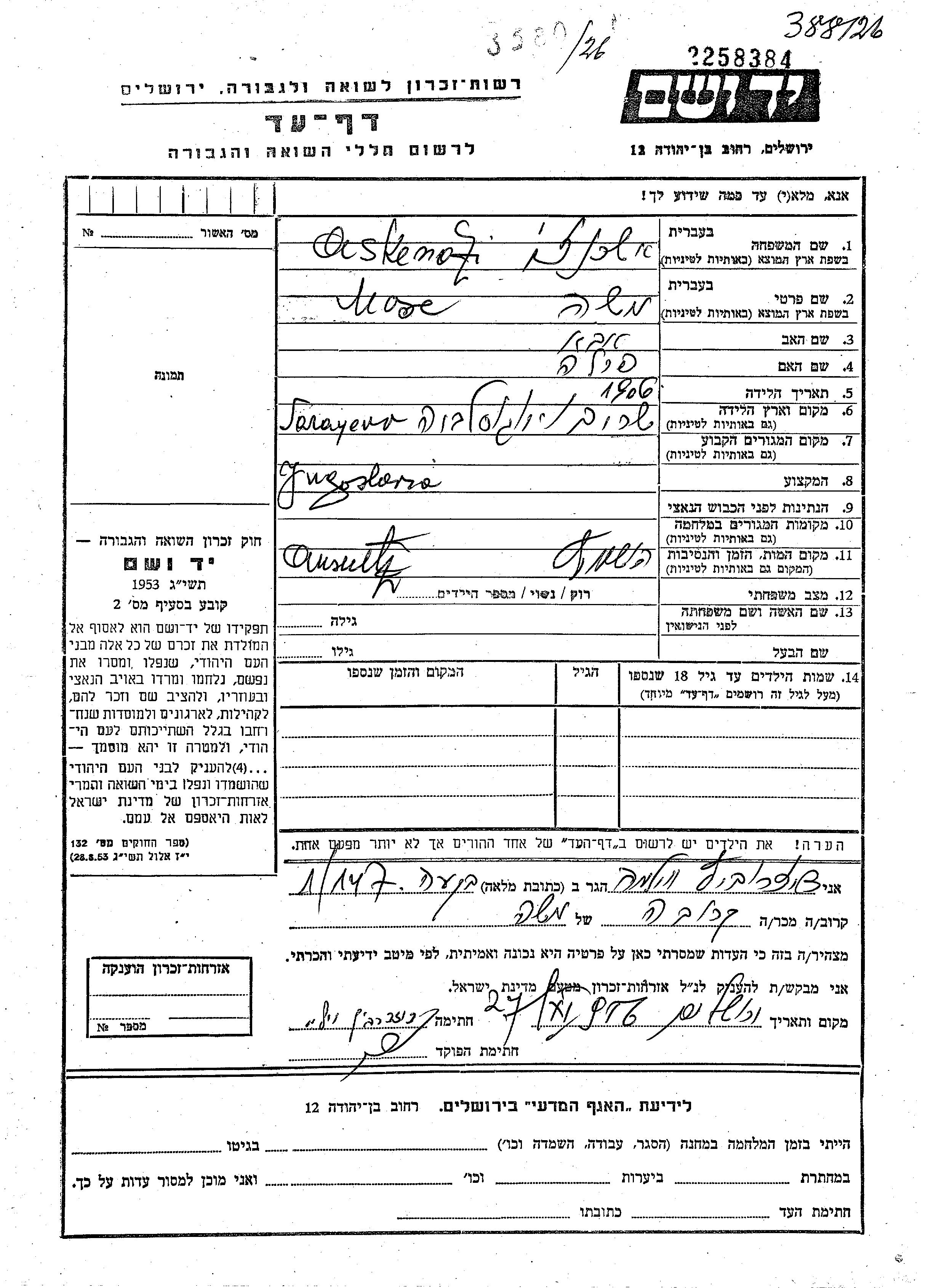 Mose Askenazi wurde im Jahr 1906 in Sarajevo, Jugoslawien geboren. Er war der Sohn von Aba und Perla.