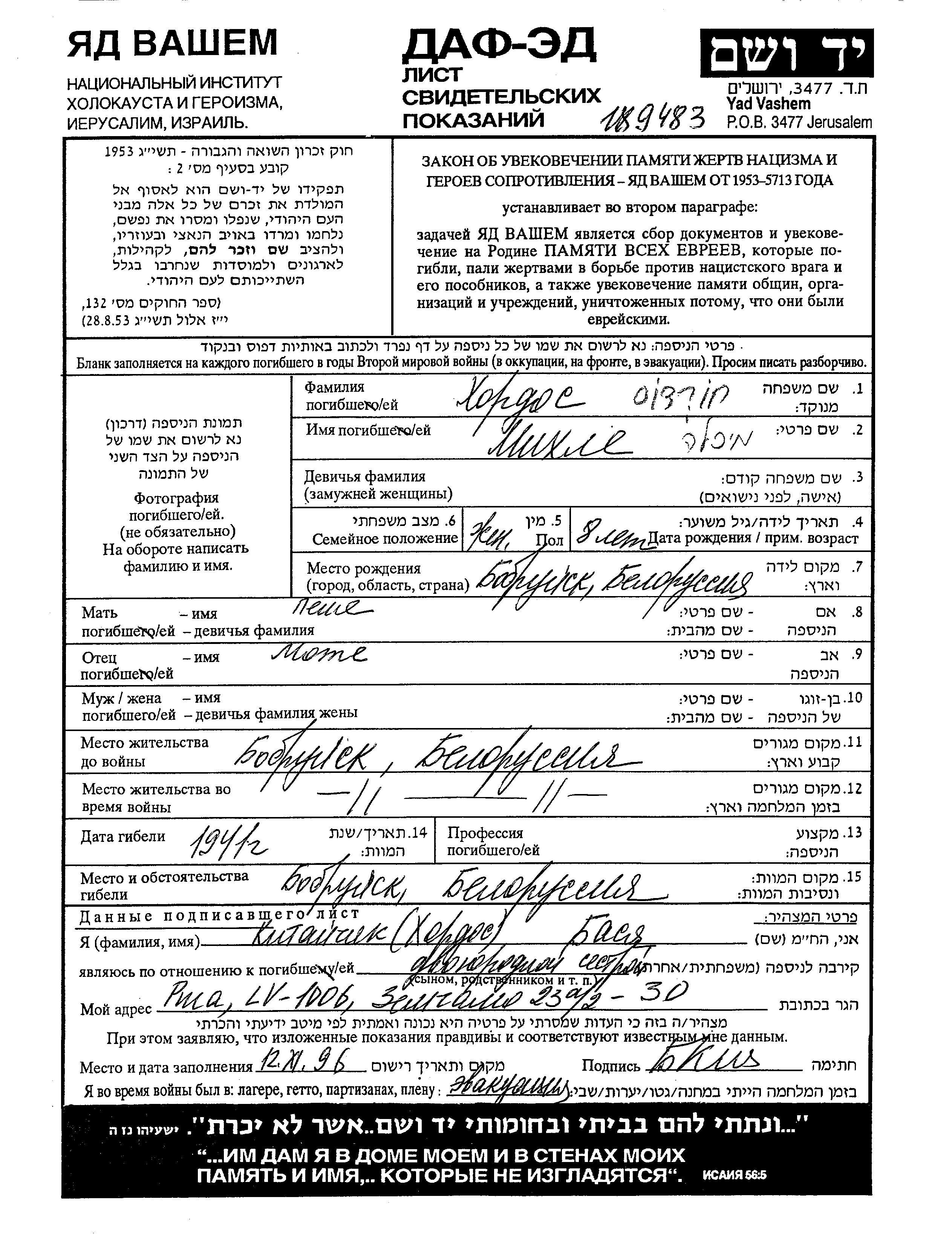 Mikhle Khordos wurde im Jahr 1933 in Bobruysk, Weißrussland (UdSSR) geboren. Sie war die Tochter von Mote Mota und Peshe. Sie war Kind. Vor dem Zweiten Weltkrieg lebte sie in Bobruysk, Weißrussland (UdSSR). Während des Krieges war sie in Bobruysk, Weißrussland (UdSSR).
