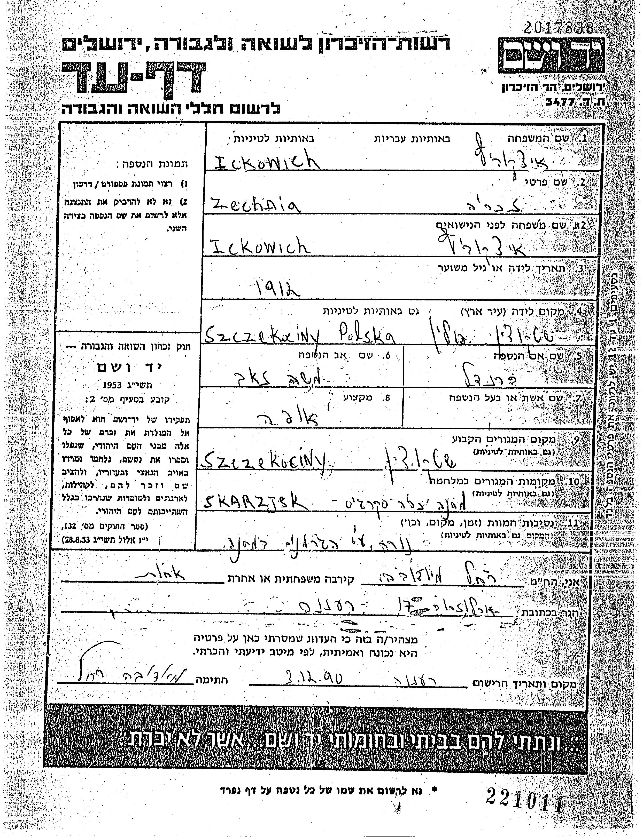 Zechria Ickowich wurde im Jahr 1912 in Szczekociny, Polen geboren. Er war der Sohn von Moshe Zeev und Brandel, geb. Rafalowich. Er war Bäcker/-in. Vor dem Zweiten Weltkrieg lebte er in Szczekociny, Polen. Während des Krieges war er in Skarzysko Kamienna, Polen.