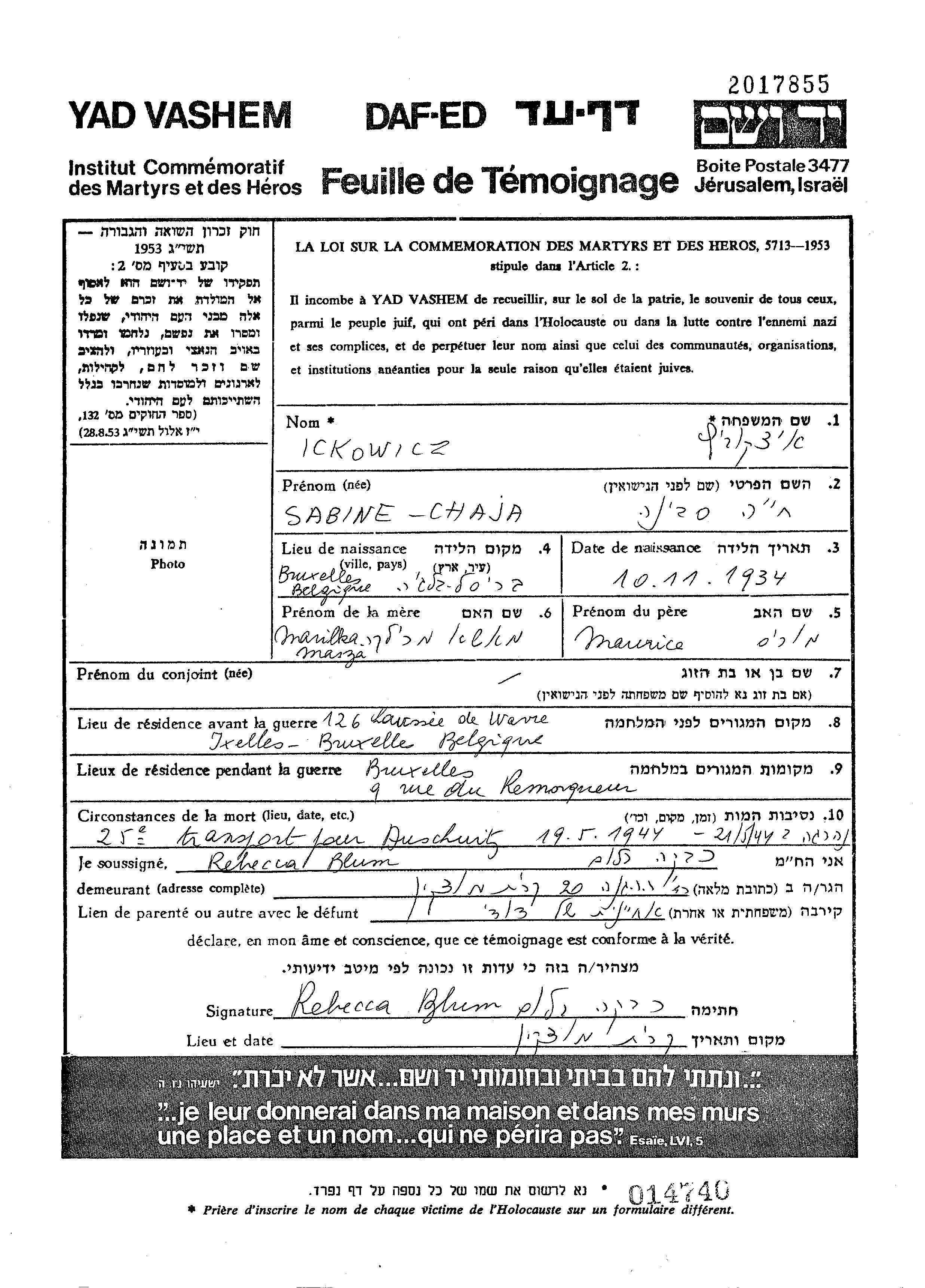 Ickowicz Chaja Sabina 1934 Bruxelles, Belgien Gedenkblatt
