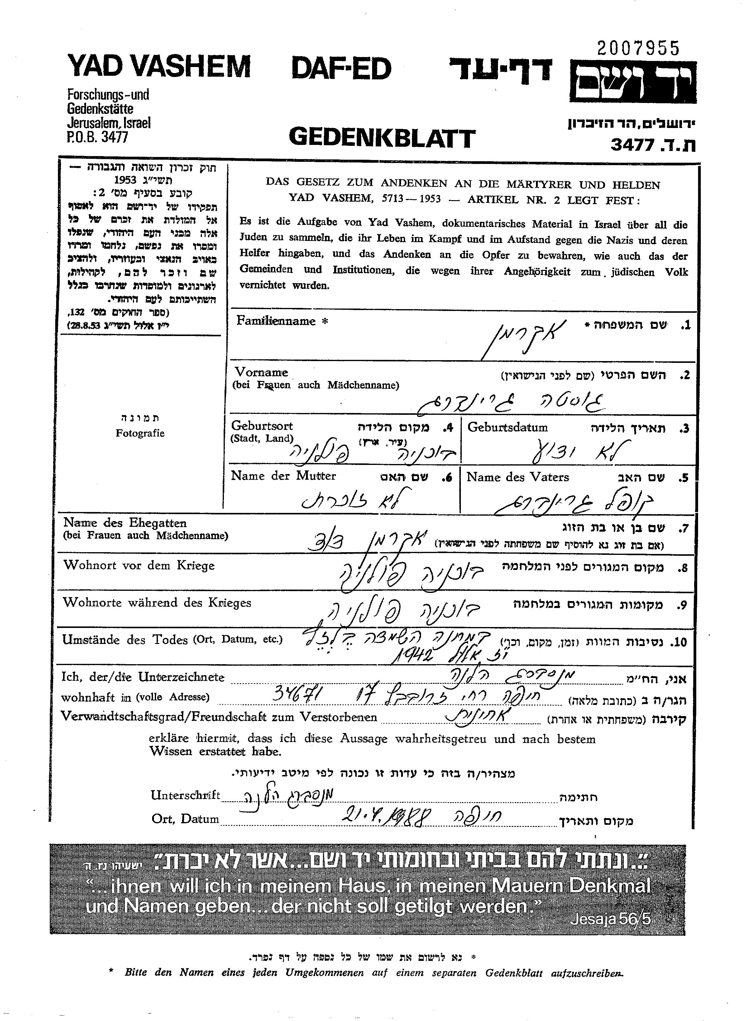 Gusta Akerman, geb. Grinberg wurde in Bochnia, Polen geboren. Sie war die Tochter von Kopel. Sie war mit David Verheiratet. Vor dem Zweiten Weltkrieg lebte sie in Bochnia, Polen. Während des Krieges war sie in Bochnia, Polen.