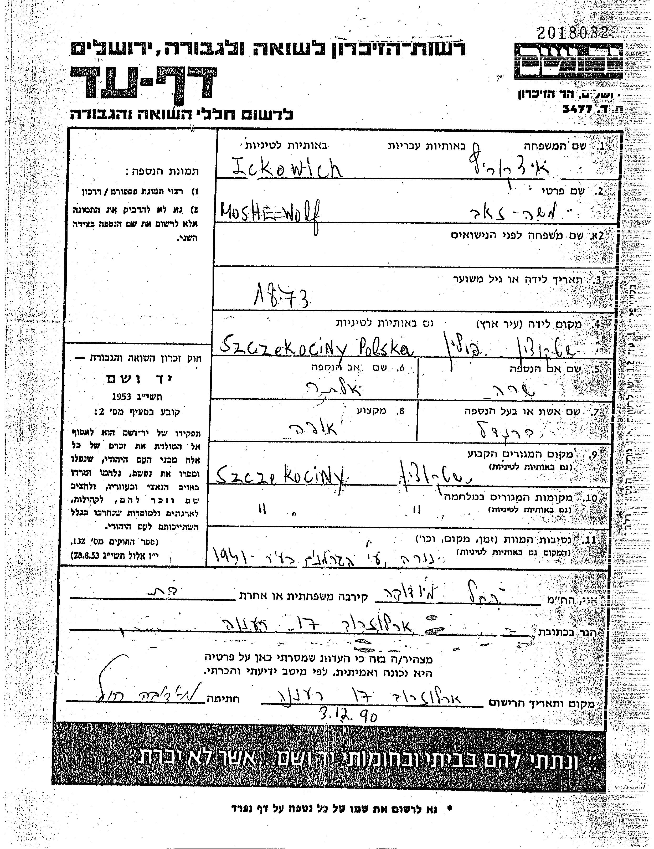 Wolf Moshe Zeev Ickowich wurde im Jahr 1873 in Szczekociny, Polen geboren. Er war der Sohn von Alter und Sara. Er war Bäcker/-in und mit Brandel Verheiratet. Vor dem Zweiten Weltkrieg lebte er in Szczekociny, Polen. Während des Krieges war er in Szczekociny, Polen.