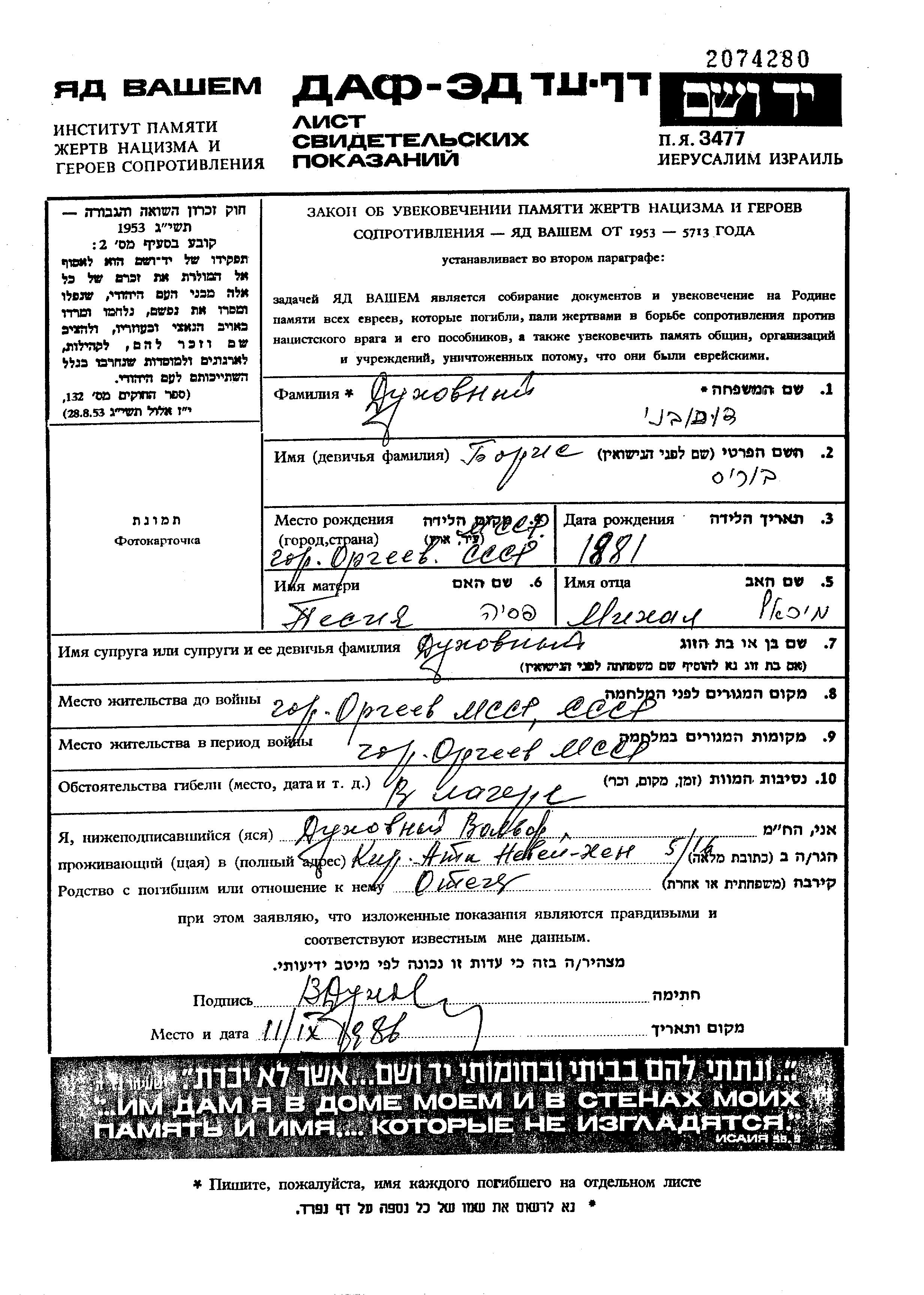 Boris Dukhovni wurde im Jahr 1881 in Orhei, Rumänien geboren. Er war der Sohn von Mikhal und Pesya. Er war mit Inda Verheiratet. Vor dem Zweiten Weltkrieg lebte er in Orhei, Rumänien. Während des Krieges war er in Orhei, Rumänien.