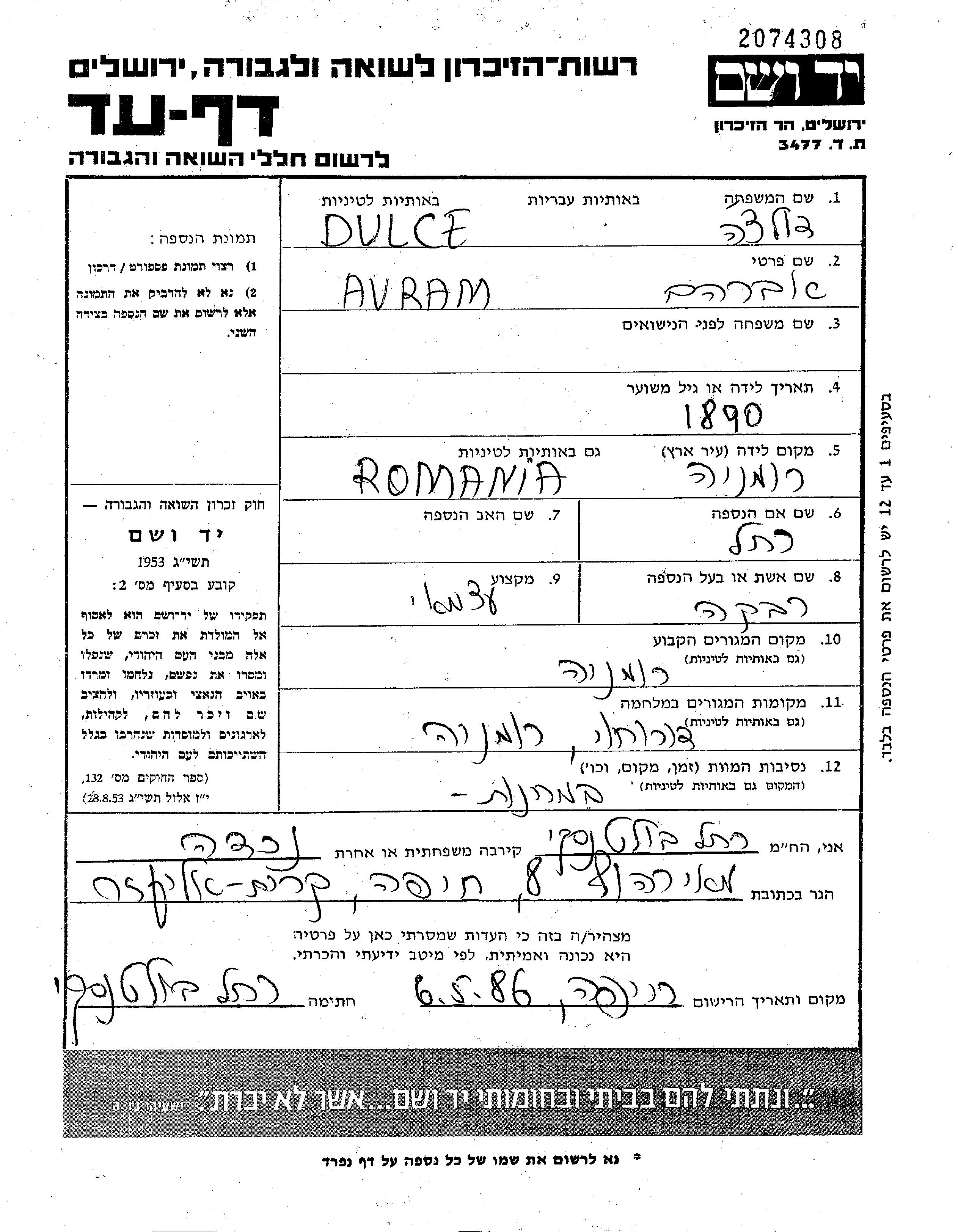 Avram Dulce wurde im Jahr 1890 in Rumänien geboren. Er war der Sohn von Rakhel. Er war Selbständig und mit Rivka Verheiratet. Vor dem Zweiten Weltkrieg lebte er in Rumänien. Während des Krieges war er in Dorohoi, Rumänien.