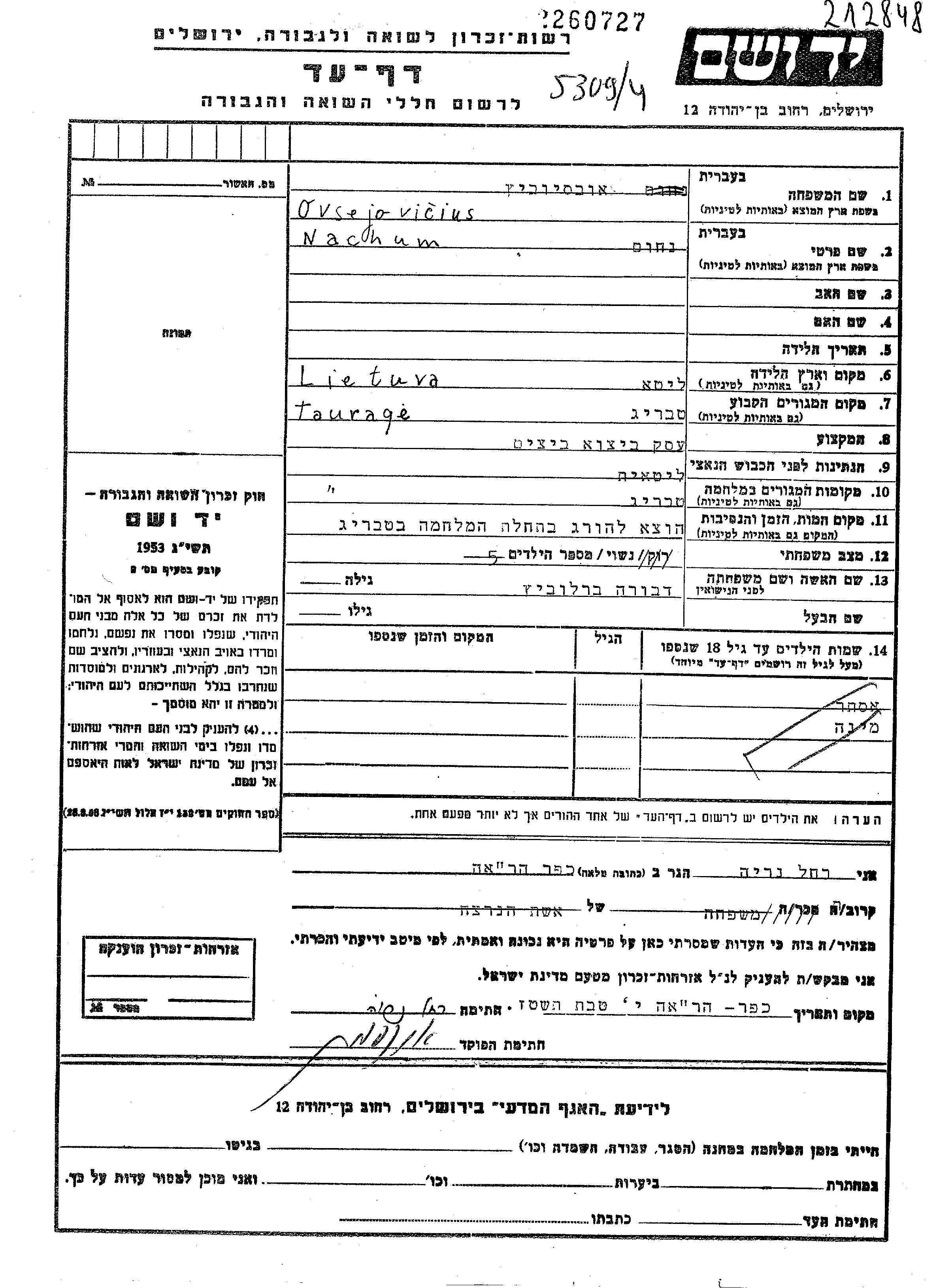 Nachum Ovsejovicius wurde in Litauen geboren. Er war Kaufmann/-frau und mit Dvora Verheiratet. Vor dem Zweiten Weltkrieg lebte er in Taurage, Litauen. Während des Krieges war er in Taurage, Litauen.