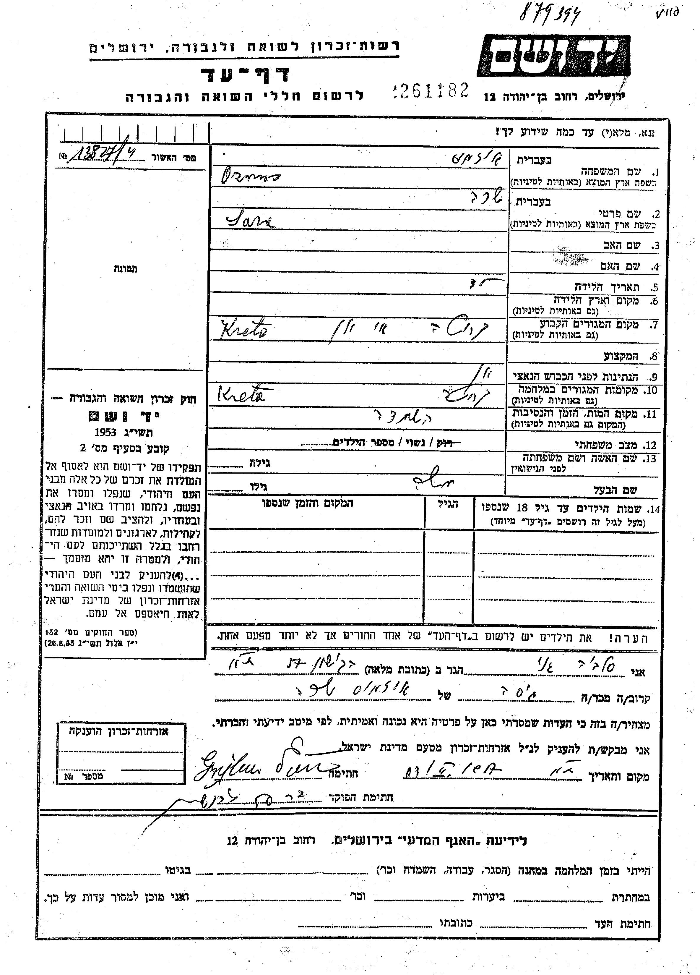 Sara Ozmos. Sie war mit Moshe Verheiratet. Vor dem Zweiten Weltkrieg lebte sie in Crete, Griechenland. Während des Krieges war sie in Crete, Griechenland.
