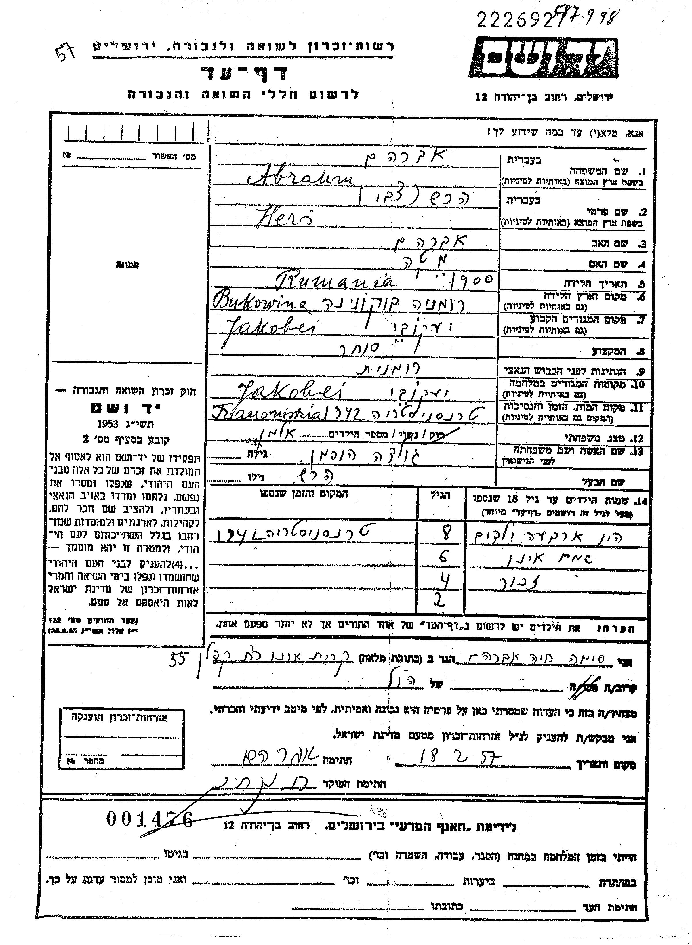Hers Tzvi Abraham wurde im Jahr 1900 in Bukovina, Rumänien geboren. Er war der Sohn von Avraham und Meta. Er war Kaufmann/-frau und mit Golda, geb. Hofman Verwitwet. Vor dem Zweiten Weltkrieg lebte er in Iacobeni, Rumänien. Während des Krieges war er in Iacobeni, Rumänien.