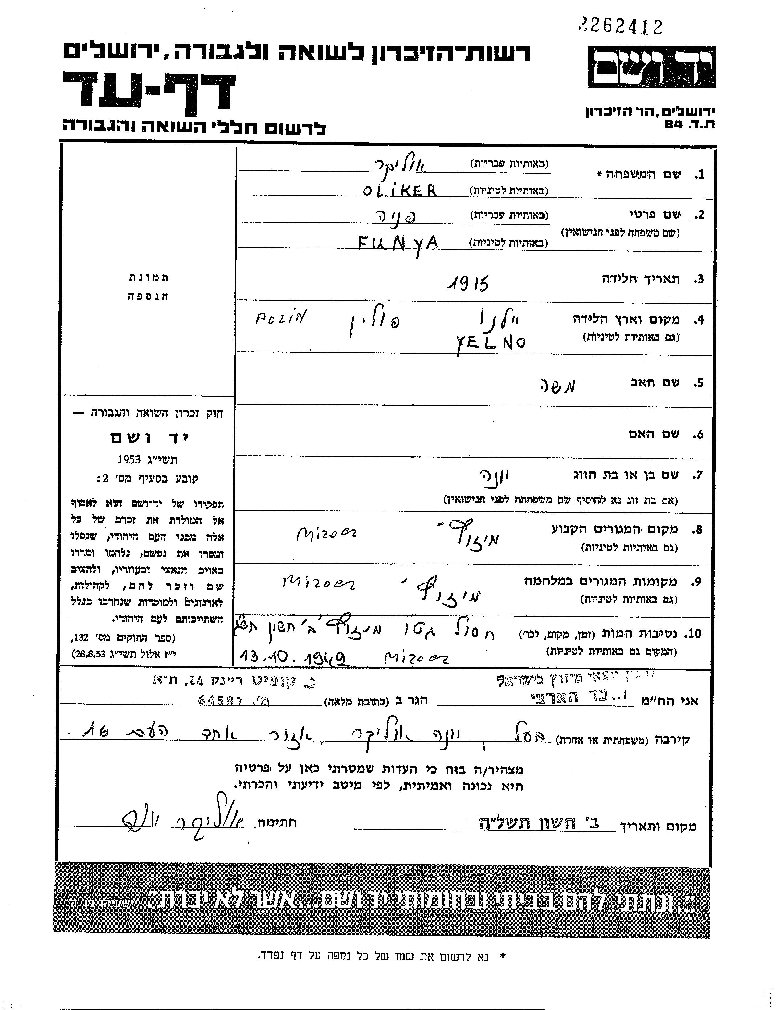 Funya Oliker wurde im Jahr 1915 in Yelno, Polen geboren. Sie war die Tochter von Moshe. Sie war mit Yona Verheiratet. Vor dem Zweiten Weltkrieg lebte sie in Mizocz, Polen. Während des Krieges war sie in Mizocz, Polen.