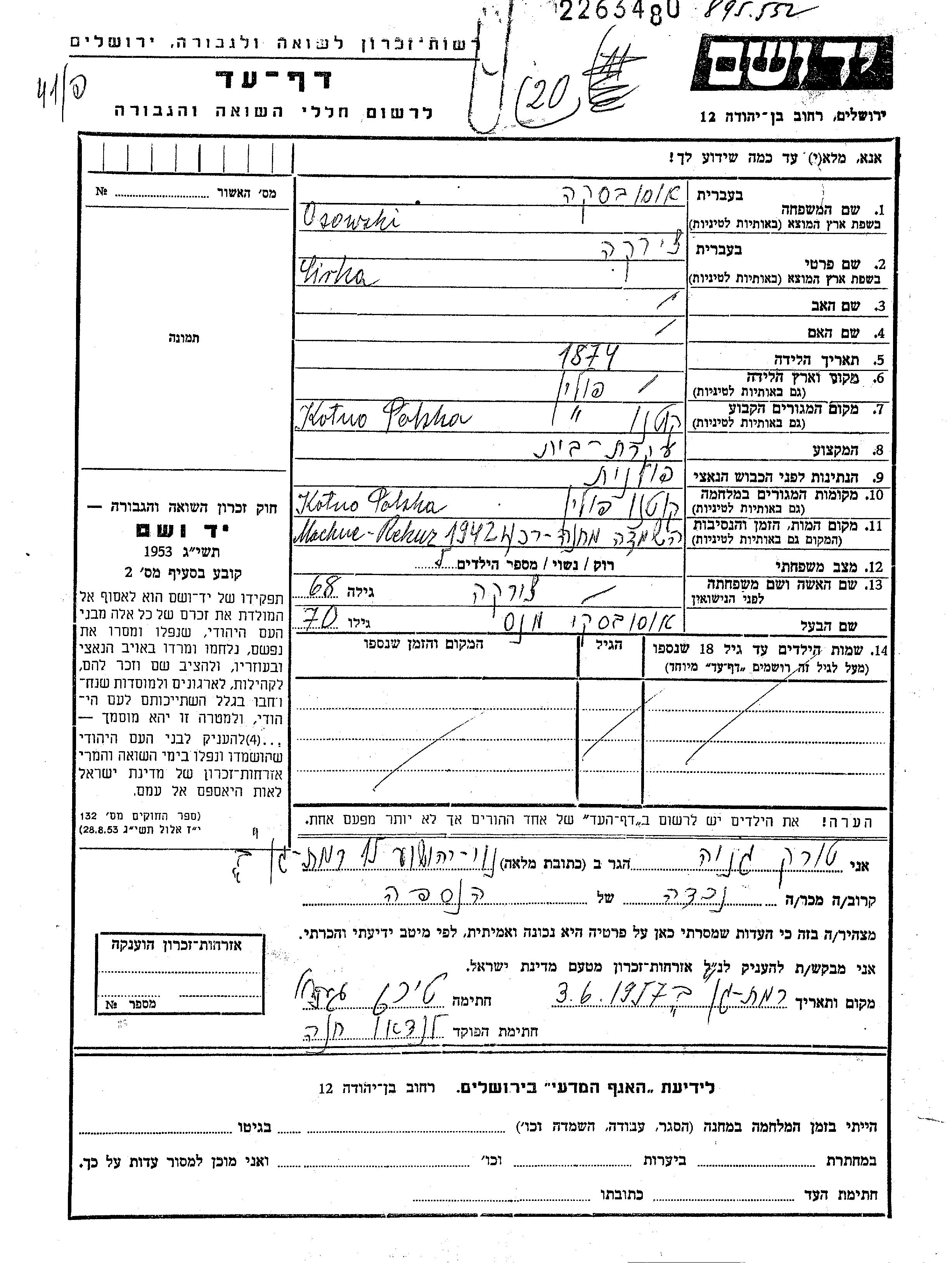 Cirka Osowzki wurde im Jahr 1874 in Polen geboren. Sie war Hausfrau und mit Manes Verheiratet. Vor dem Zweiten Weltkrieg lebte sie in Kutno, Polen. Während des Krieges war sie in Kutno, Polen.