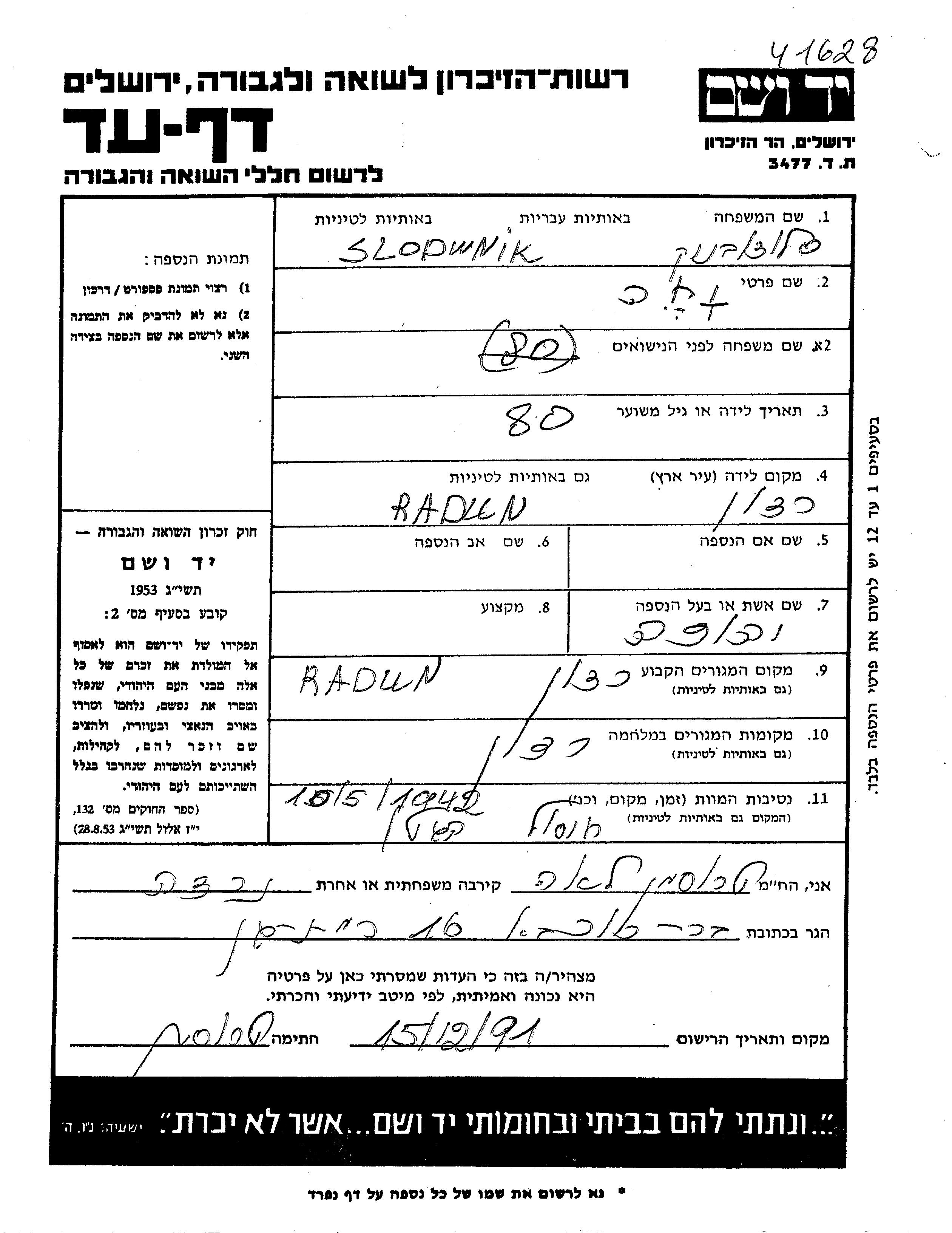 Yakha Slodownik wurde in Radun, Polen geboren. Sie war mit Yehuda Verheiratet. Vor dem Zweiten Weltkrieg lebte sie in Radun, Polen. Während des Krieges war sie in Radun, Polen.