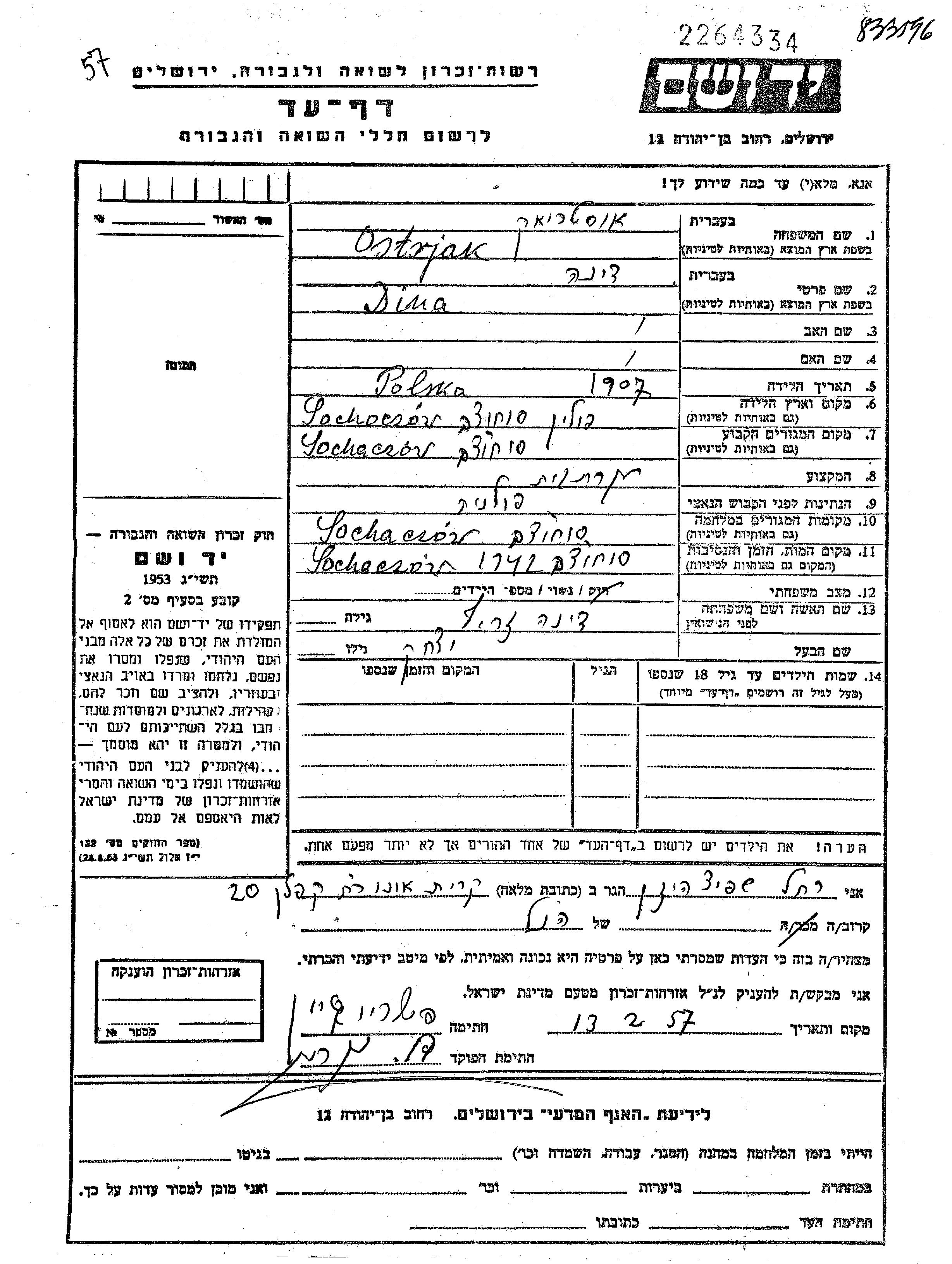 Dina Ostriak, geb. Zerich wurde im Jahr 1907 in Sochocin, Polen geboren. Sie war Hausfrau und mit Yitzkhak Verheiratet. Vor dem Zweiten Weltkrieg lebte sie in Sochocin, Polen. Während des Krieges war sie in Sochocin, Polen.