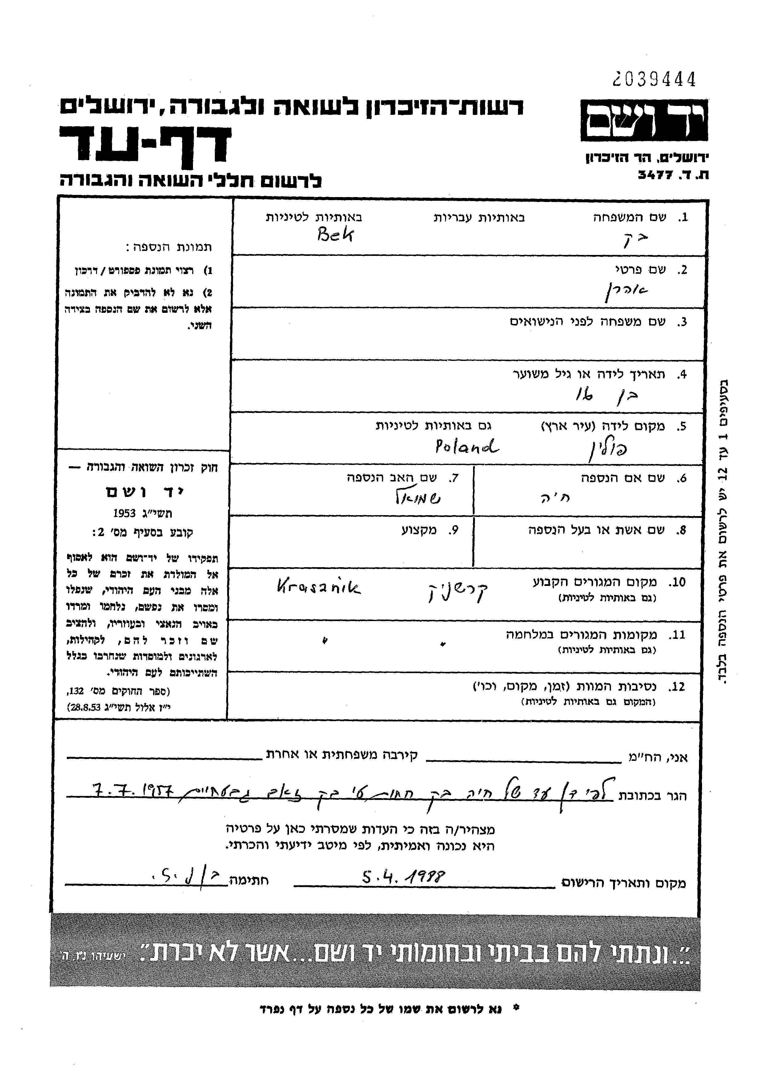 Malka Gros wurde in Radomysl Wielki, Polen geboren. Sie war mit Pinchas Verheiratet. Vor dem Zweiten Weltkrieg lebte sie in Radomysl Wielki, Polen. Während des Krieges war sie in Radomysl Wielki, Polen.